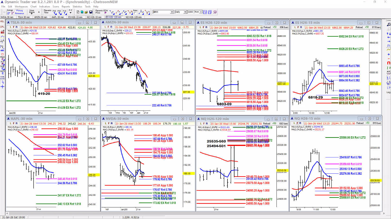 In planning their trades and initiating a trade from a setup, the Team looks for EMA crossovers and pattern shifts as described in the trading plan and trigger videos and write-ups. Initial trade targets are calculated using the same Fibonacci ratios, with the initial targets for a trend trade setup being the 1.272, 1.618 and then 2.618 extensions.