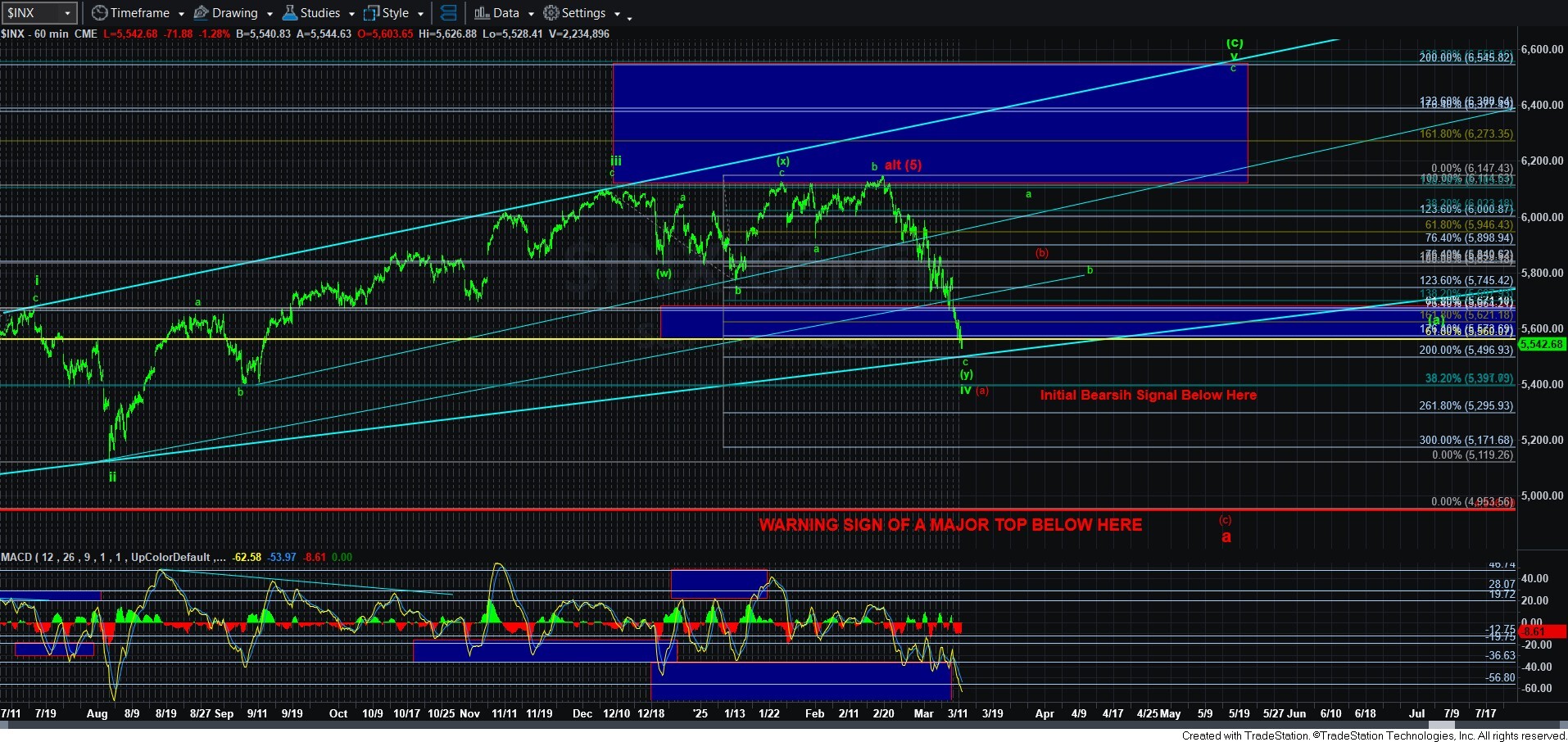Clearly, the market is in a very treacherous posture. And, the resistance region I have now outlined on the 5-minute SPX chart has taken on much more prominence due to the break-down below 5550SPX. And, should we continue lower, then I would continue to move that resistance down. We will now need to break out through that resistance to make the green count gain again in probability. But, as long as we remain below that resistance, I am going to be a bit more cautious, especially if we see a 5-wave decline after a rally to that resistance box (wherever it may reside once we strike a bottom to this decline).