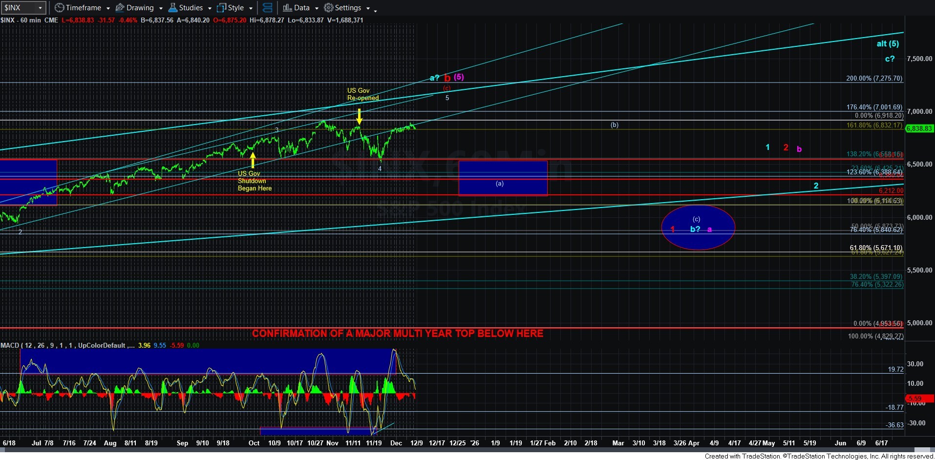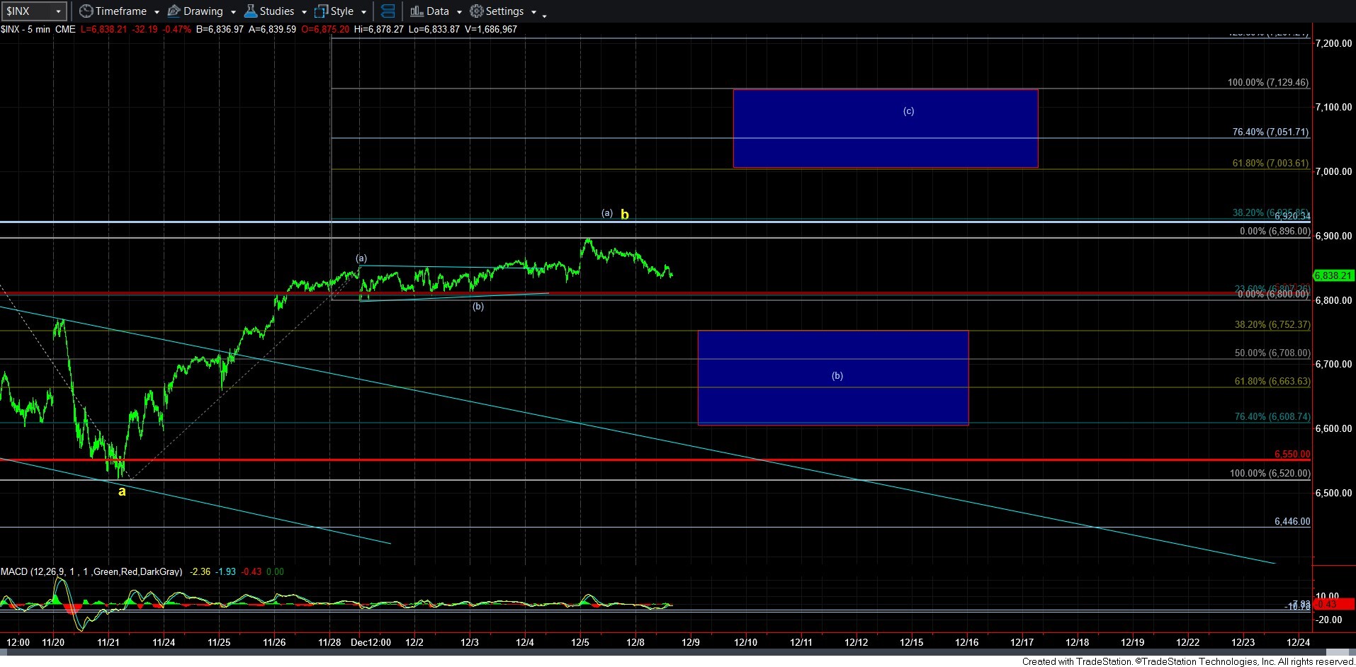 But, now we are meandering in a smaller range. And, the market is now seemingly playing the same game with the 6810SPX level. And, as long as we remain over that support, there is a reasonable interpretation that would suggest we can rally to the upper box on the 5-minute SPX chart to complete a (c) wave, and potentially finally top out in a 5th wave of a larger c-wave off the April low.