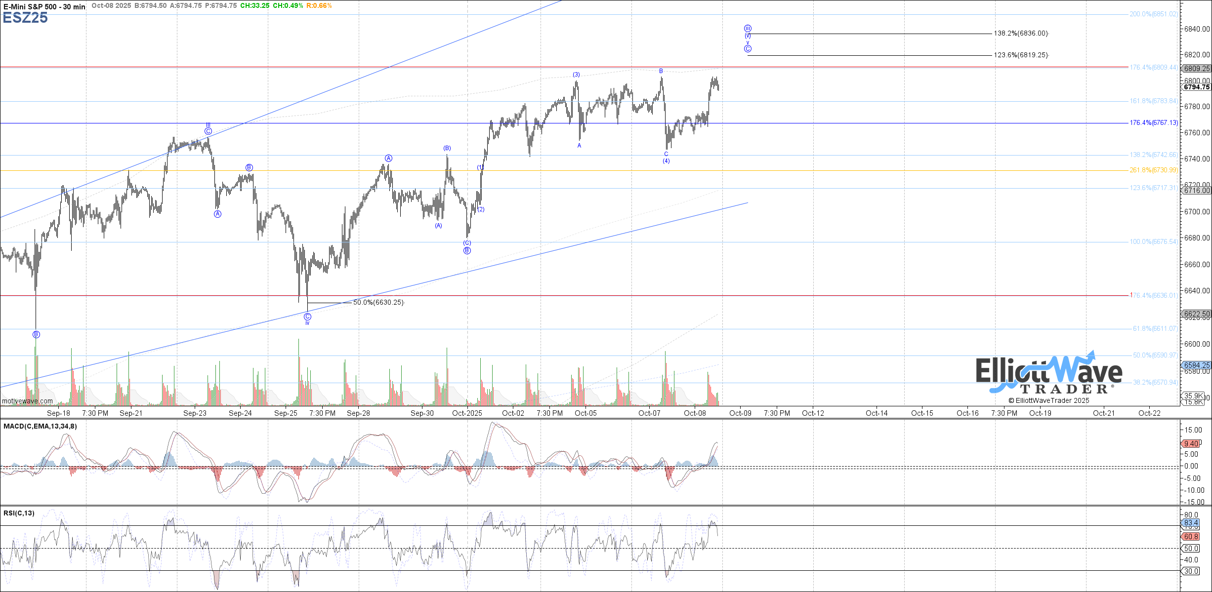 Therefore, price appears to want to attempt another high as at least further extension in wave C of v. Assuming a higher high is seen, 6809.50 and 6819.25 ES are now the next fib targets possible to reach above yesterday's high.
