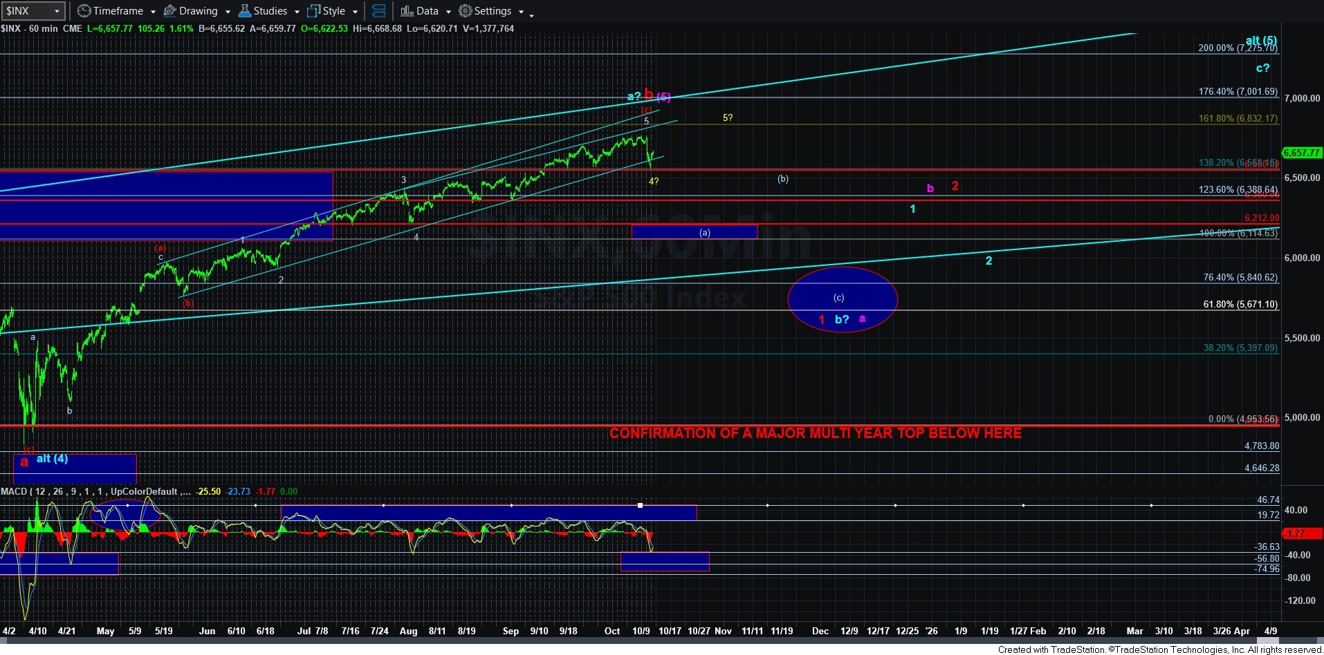 For now, I think it is reasonable to expect the SPX to head higher at least towards the .764 retracement region. While the ES does have potential for more of a (b) wave pullback in the coming day or so, we do not see the same indication in the SPX. So, I am unsure as to whether we are going directly higher to the .764 retracement region or not right now.