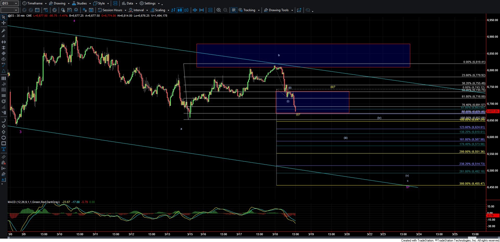 If we manage to break back under the 6672 level, that would further confirm that we are indeed in wave (iii) of C down as laid out per the white count on the ES chart. Further confirmation would come with a break back under the 6645 level, which represents the 100% extension of the initial move down off the highs.