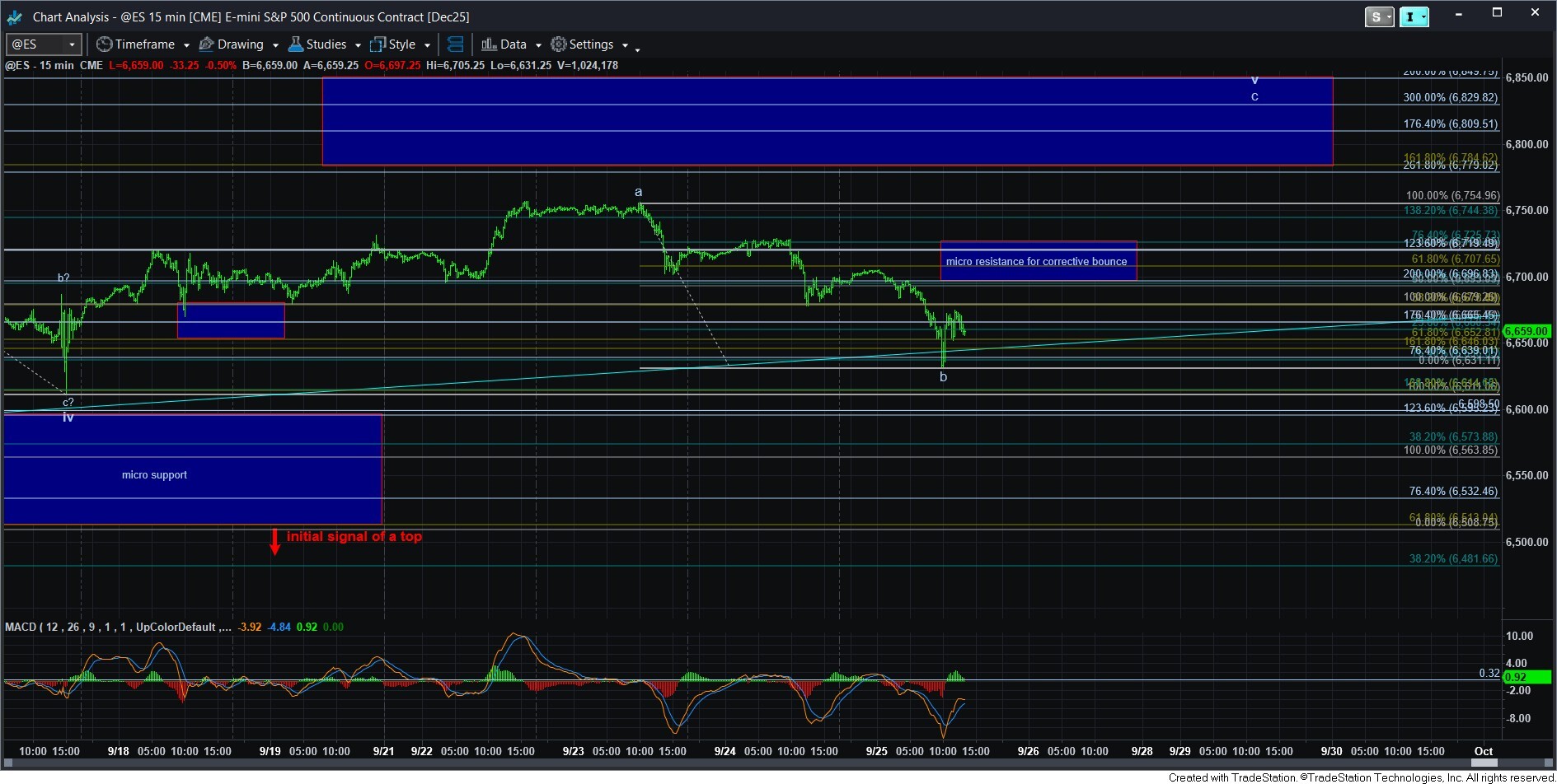 As you can see from the attached 15-minute ES chart, if we view the last rally as the a-wave of wave v, then this deep pullback would be the b-wave of wave v. The issue we then confront is that the c-wave “should” be a 5-wave structure. Yet, the best I can come up with off today’s pullback low is a leading diagonal to begin the c-wave. Clearly, I cannot say that is the most reliable of patterns to make a higher high seem a high probability at this time.