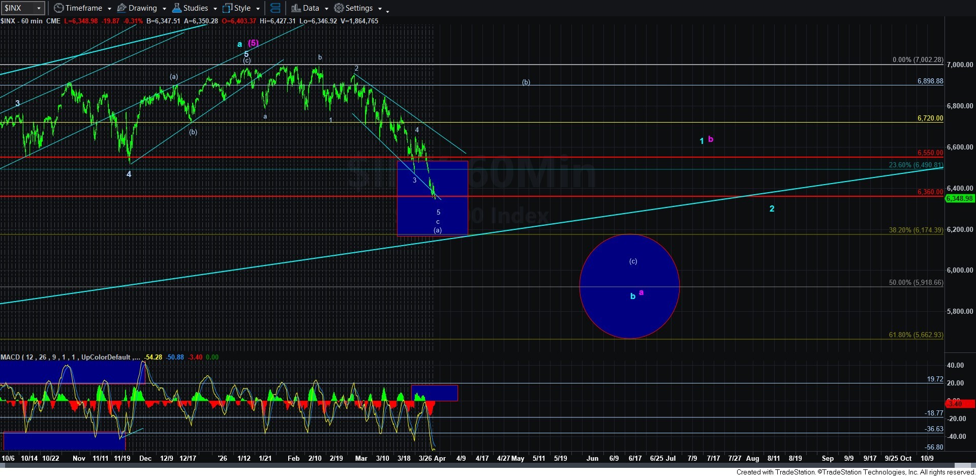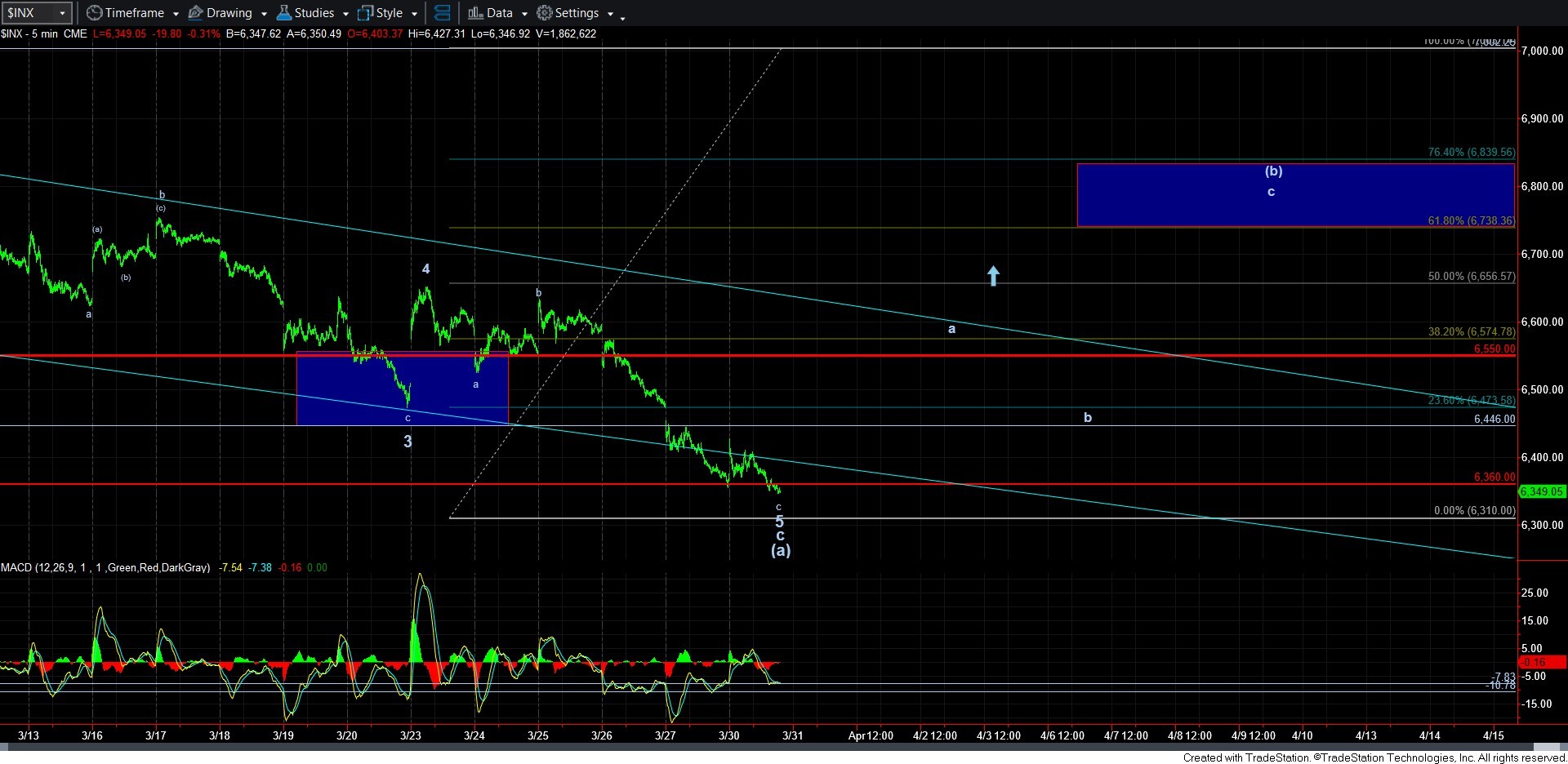 I always find it a challenge when we have one pattern playing out in the SPX and another in the futures. As I write this, the futures have struck the support I noted over the weekend at 6360ES, and have seen a large rebound off that low. However, the SPX pattern seemed incomplete, which is maybe why we are seeing the lower lows in SPX, whereas this may only be a corrective b-wave pullback in ES. And, that is how I have it analyzed on the various charts.
