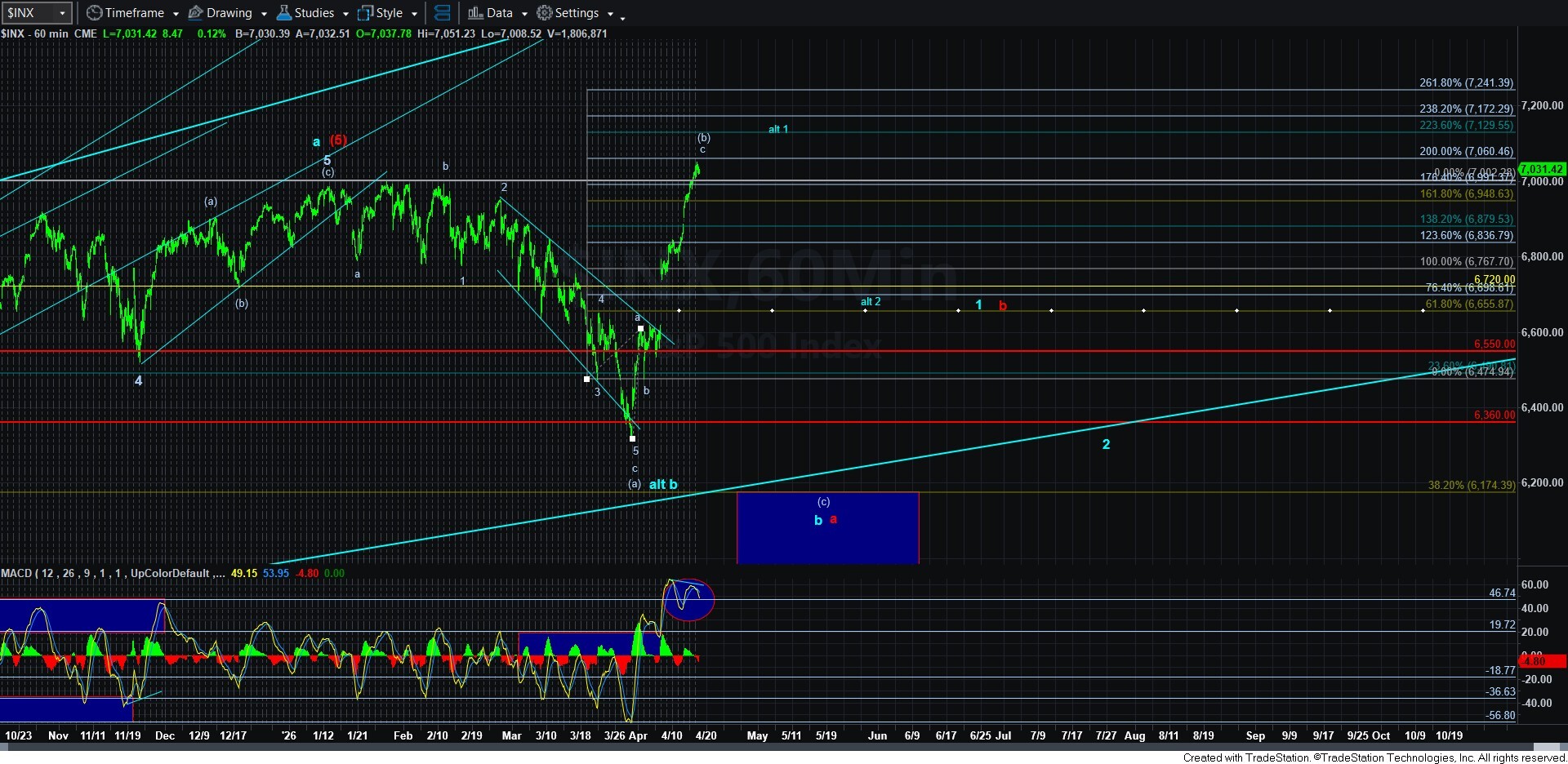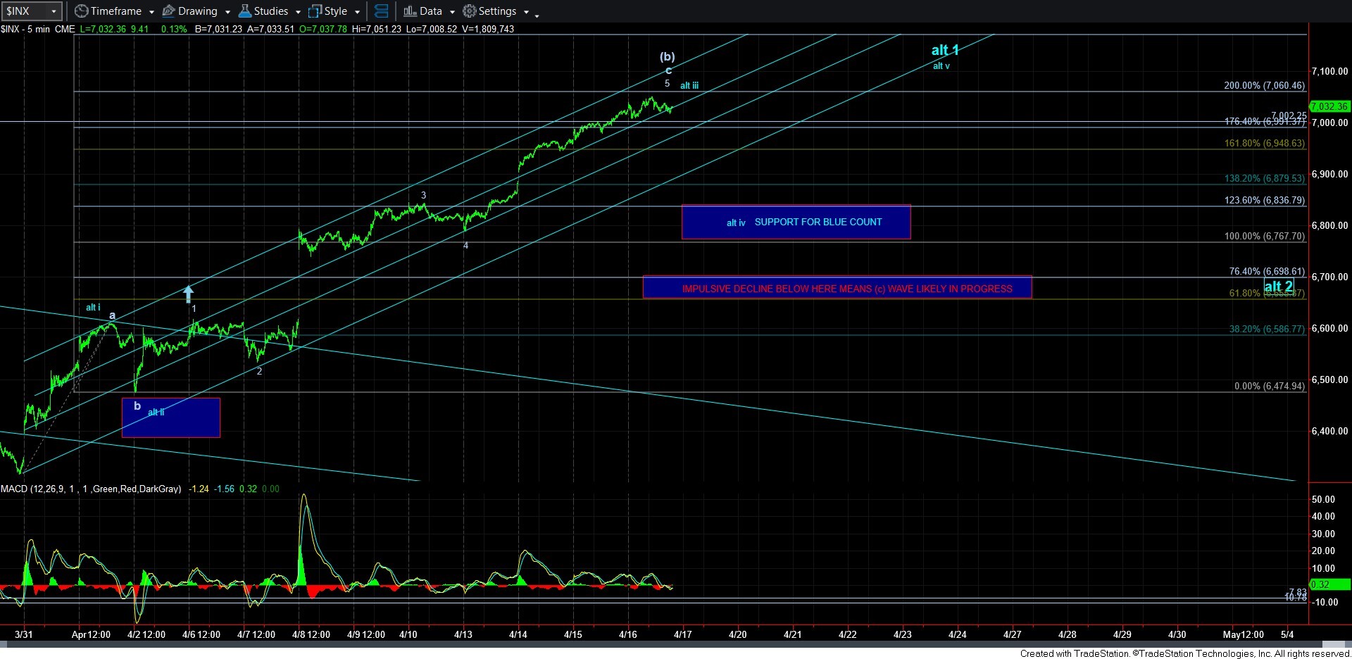 So, as we approach the 2.00 extension for just this wave segment, it is clear that the wave count is quite full. But, no support has yet been broken. While the 60-minute MACD is still displaying the warning sign of a negative divergence and has begun to roll over already, we will need to break the 6940/50SPX minor support region to set our sights on the bigger support represented by the blue wave iv box on the 5-minute chart.