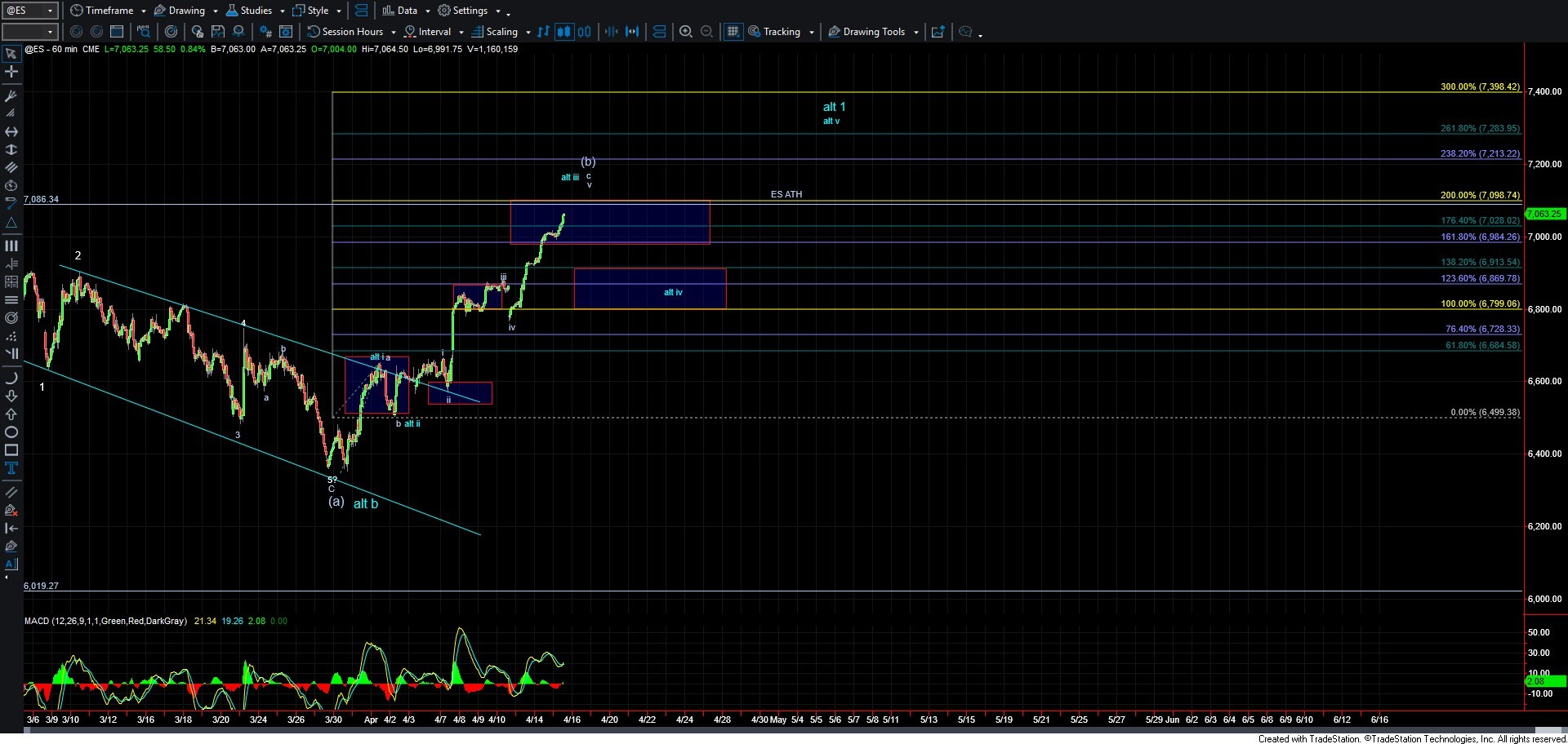 Alternatively, if the market pulls back in a clearly corrective manner that holds that support region and is followed by a break above the wave iii high, it would suggest that the market has already completed a bottom in a larger wave b at the March 30th lows and is now working higher in a developing impulsive structure as laid out per the blue count.