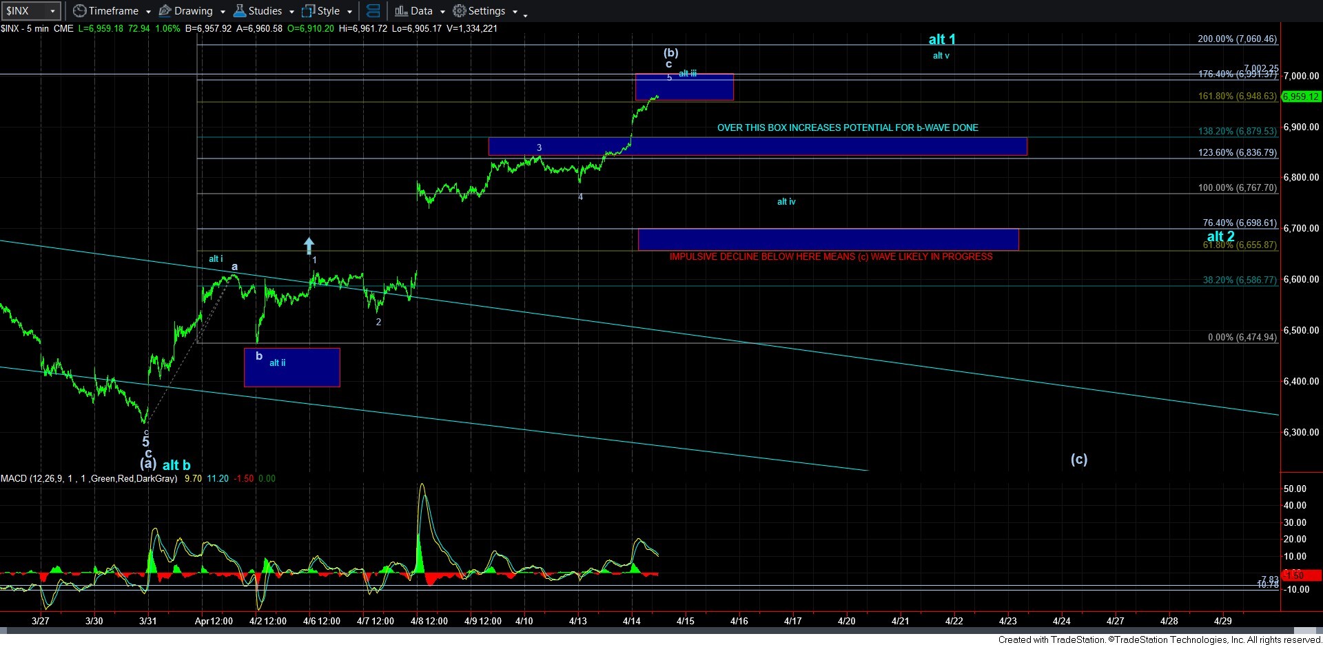 As I also noted on the 5-minute chart, should we exceed that box, it does open the door to the potential that the blue b-wave has completed. That was the alternative count on the chart. However, and this is very important, if a larger degree blue c-wave rally has indeed begun, then we will need to complete 5 waves up off the recent low for wave 1 of that c-wave. And, thus far, we only have 3 waves up. So, until I actually see alt iv-v completed, I am still going to view this rally as a (b) wave.