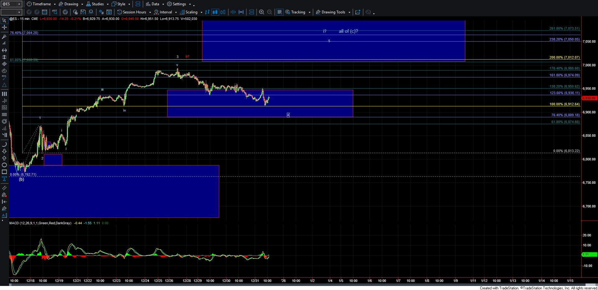 If we break below support, which I now have at the 6,912–6,889 zone, it would open the door for a larger top to be in place. However, the structure off the highs is more supportive of this still being wave 4, so this will remain the base case as long as we can hold support.