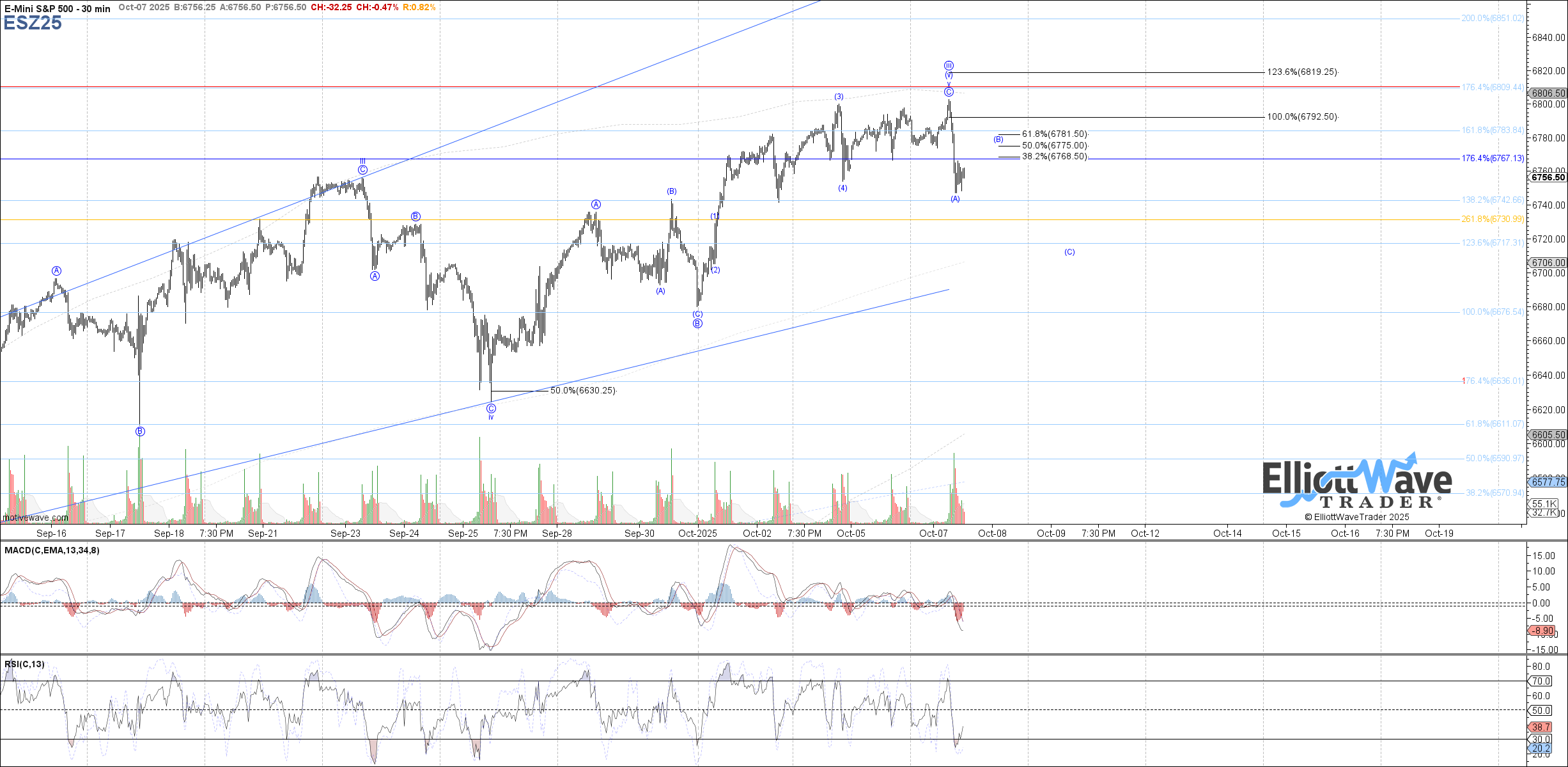 Until then, there is not a clear setup at the moment to assume that price is going to turn back up toward new highs again, but it is reasonable to treat at least an initial (A)-wave down from the pre-market high as complete and price working on a (B)-wave bounce. Based on that expectation, 6768.50 - 6781.50 is retrace resistance that can be tested before wave (B) completes.