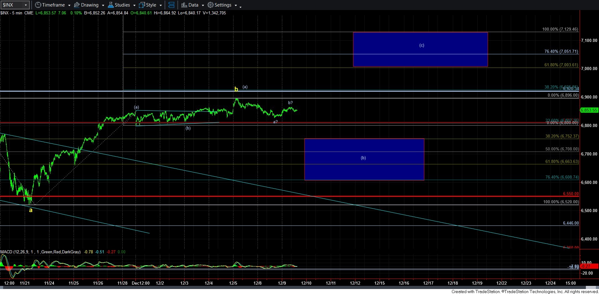 But, if there is a path to take us lower, it would suggest that we are in an a-b-c structure pointing down to the support box below. Yet, keep in mind, as long as we are over 6810SPX, the bulls can push us in a more direct fashion towards the target box overhead.