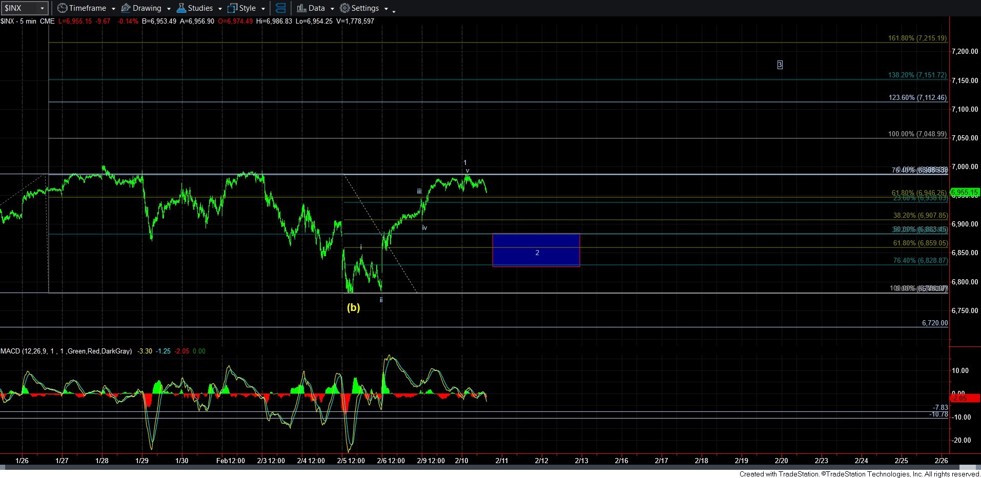 As you can see, I have added a support box between the .500-.764 retracement of what I have labeled as wave 1, which is basically the 6828-6883SPX region. For now, micro support is in the 6945-50SPX region. Once that breaks, it should provide us with an initial indication that wave 2 is in progress.