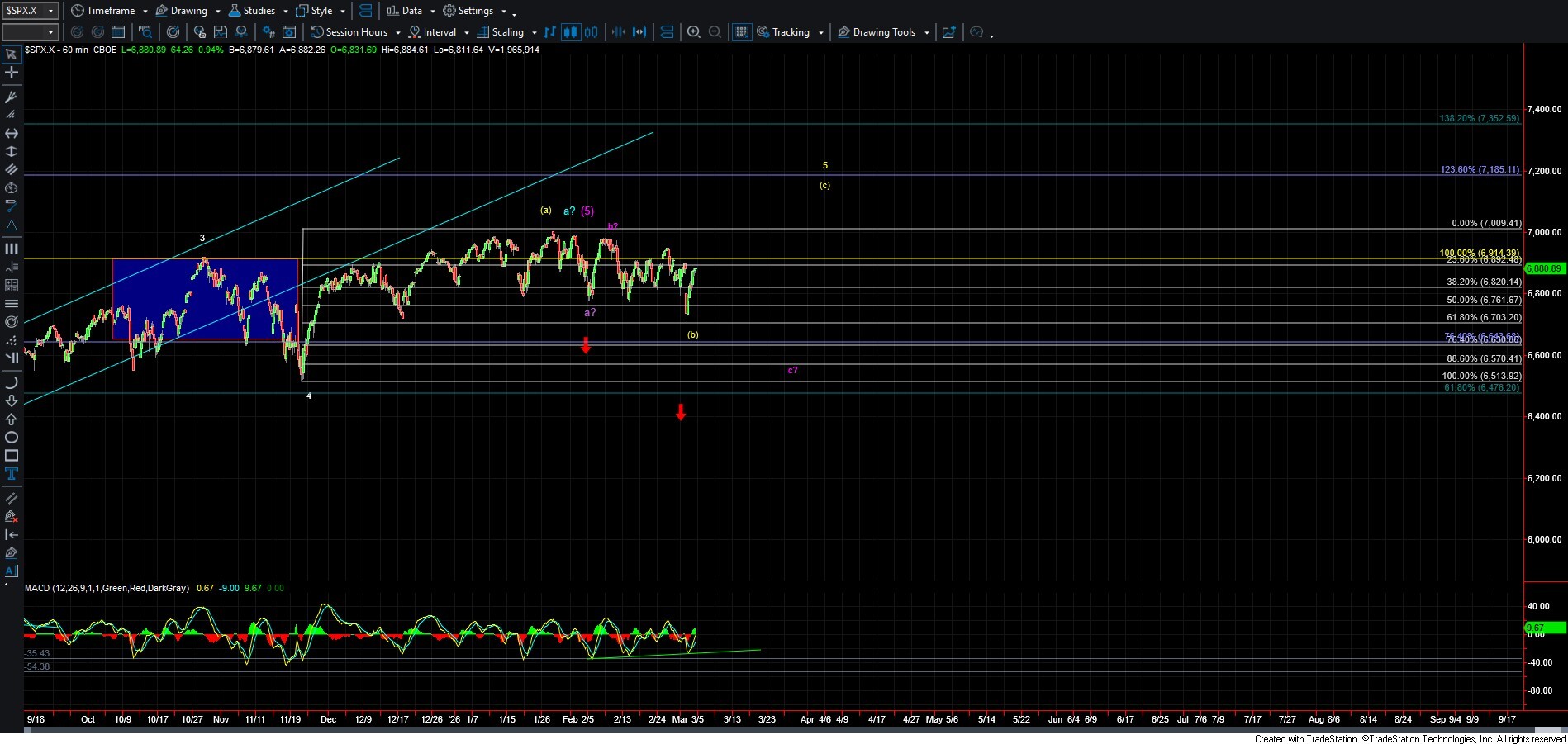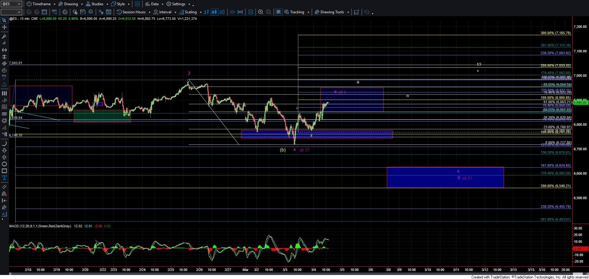 While there are several issues with this count, I do want to note that we have now formed a nice positive divergence on the MACD on the 60-minute chart, and we also bounced right off the 61.8% retrace of the potential wave (a). These factors are providing some larger-degree support for the yellow count. To keep this potential impulsive path intact, I would want to see the price hold over the 6810 level. A break below that level would serve as an early warning sign that we may not see direct upside follow-through under this scenario.