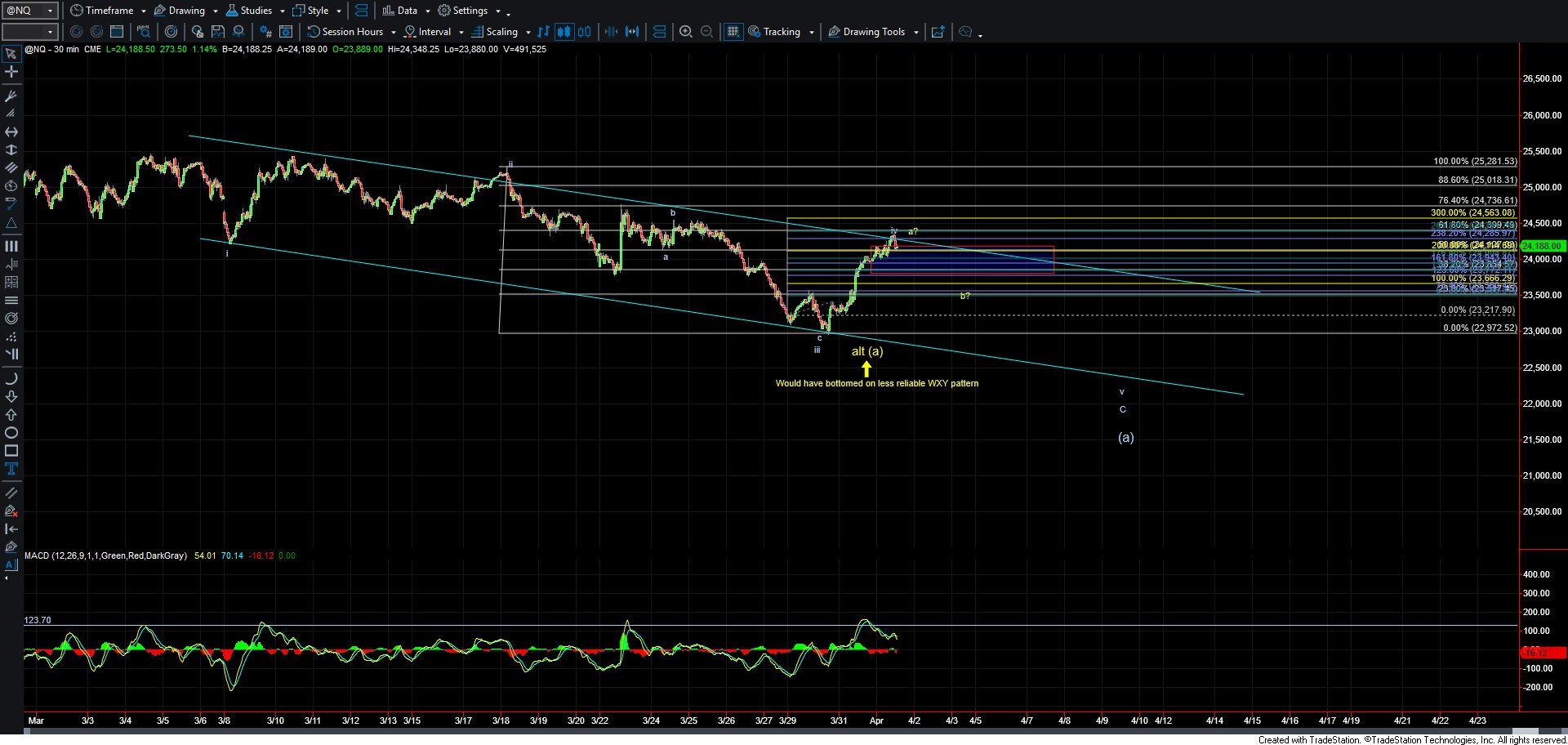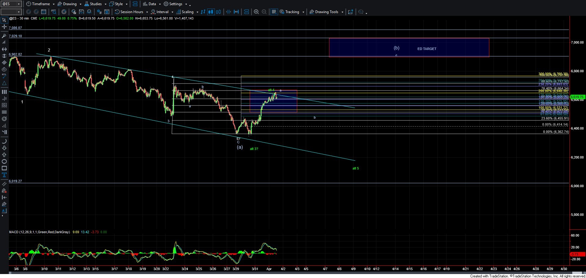 Today, the market continued to push higher, and we can now reasonably count the move off the lows as a five-wave structure. This increases the probability that a bottom has been put in for wave (a), and that we are now progressing within a larger wave (b) to the upside. That said, we have not yet cleared a key resistance region on both the SPX and the Nasdaq, which keeps the path to another low very much in play. In addition, the Nasdaq still lacks a clean, completed structure to the downside, which adds another layer of caution and further supports the possibility that another lower low could still develop.