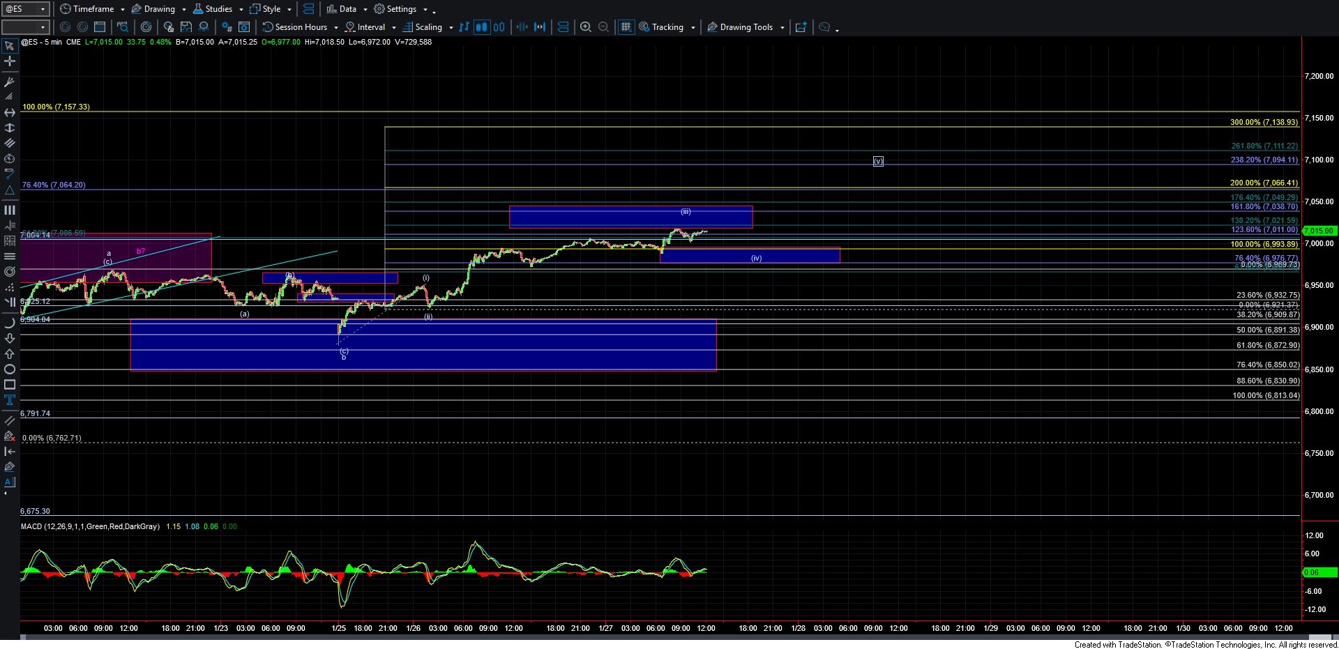 Earlier today, we hit the 138.2% extension of the initial wave (i) up, as shown on the charts, which sits at the lower end of the target region for a standard wave (iii). From there, we saw a flat consolidation for much of the afternoon. We are now pushing higher once again into the close after holding over the 6993–6976 support zone, which continues to keep the standard impulsive wave structure off the Sunday night low intact.