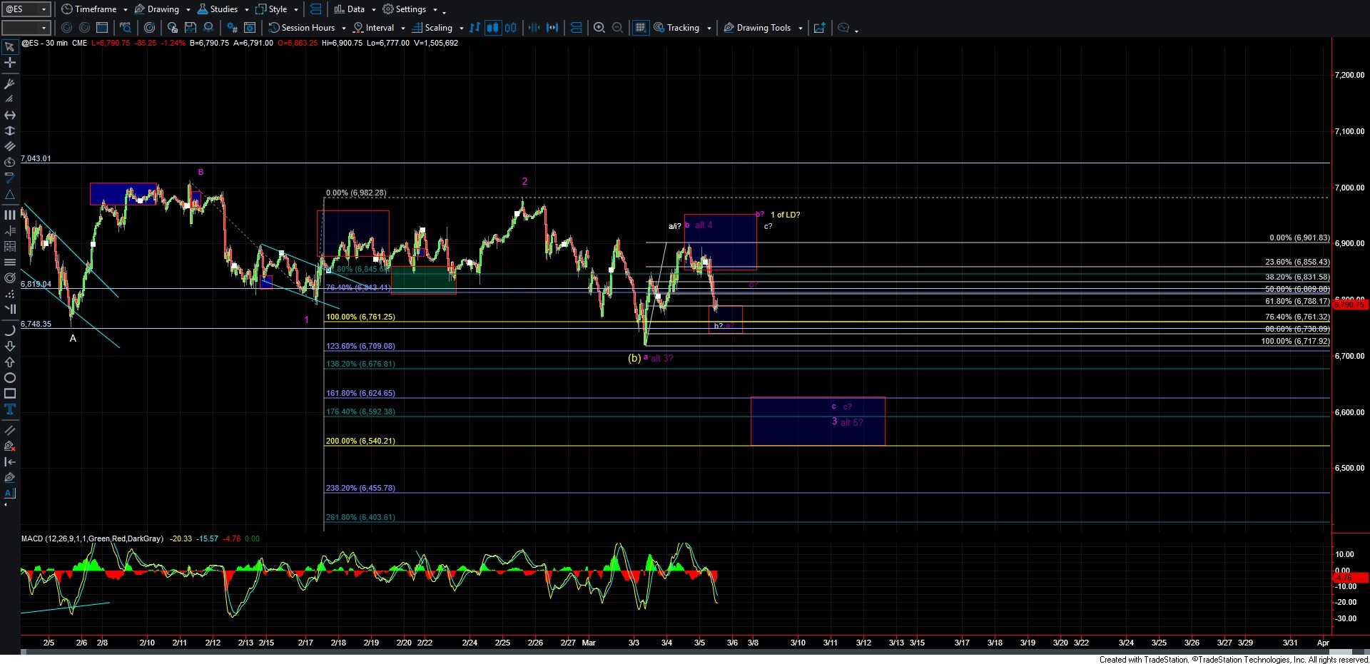 The two purple counts, both of which point lower, appear much more likely at this point. However, which of the two paths the market ultimately follows is not entirely clear. I can also see the potential for the market to hold over the 6717 low and make another push back over the 6901 level before turning lower. Under that scenario, support would come in around the 6761–6730 region. If we hold that zone and turn up in five waves, it would open the door for another move back over the 6901 level before rolling over once again.