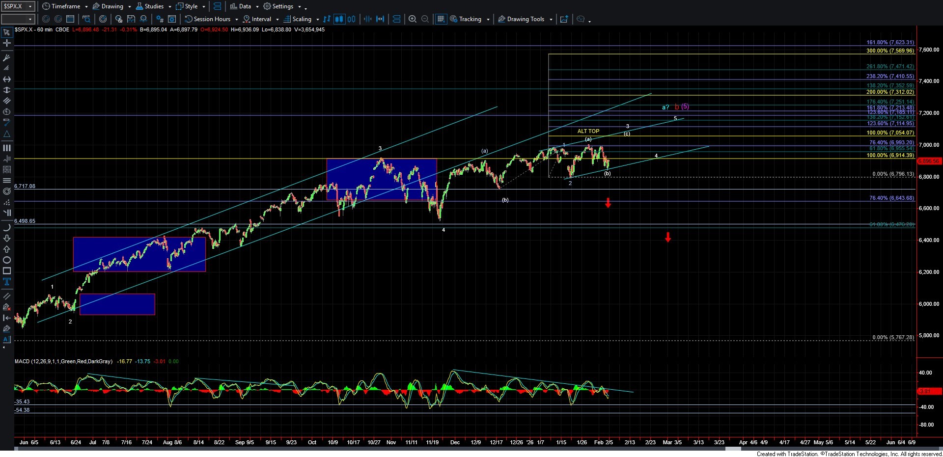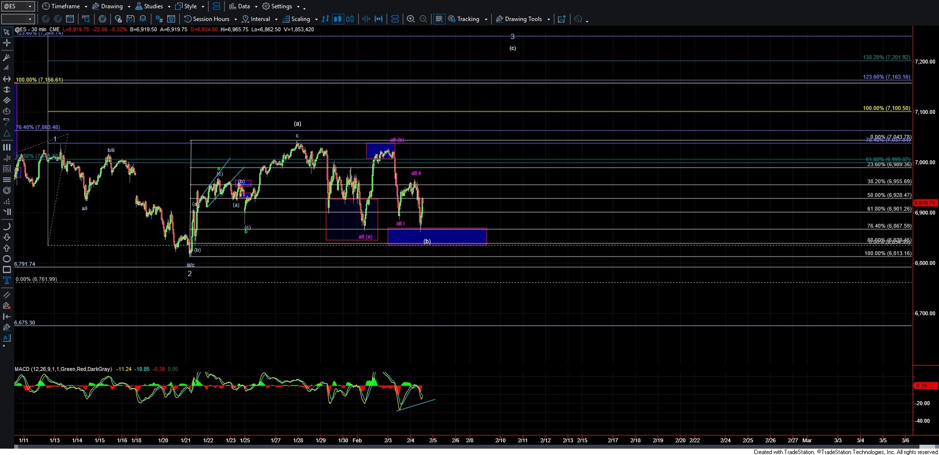 If, however, we are unable to push back over the 6965 level and instead move lower once again, breaking under today’s low, followed by a break under the 6839 level, this would make the purple count much more probable and open the door for a larger-degree top to be in place.
