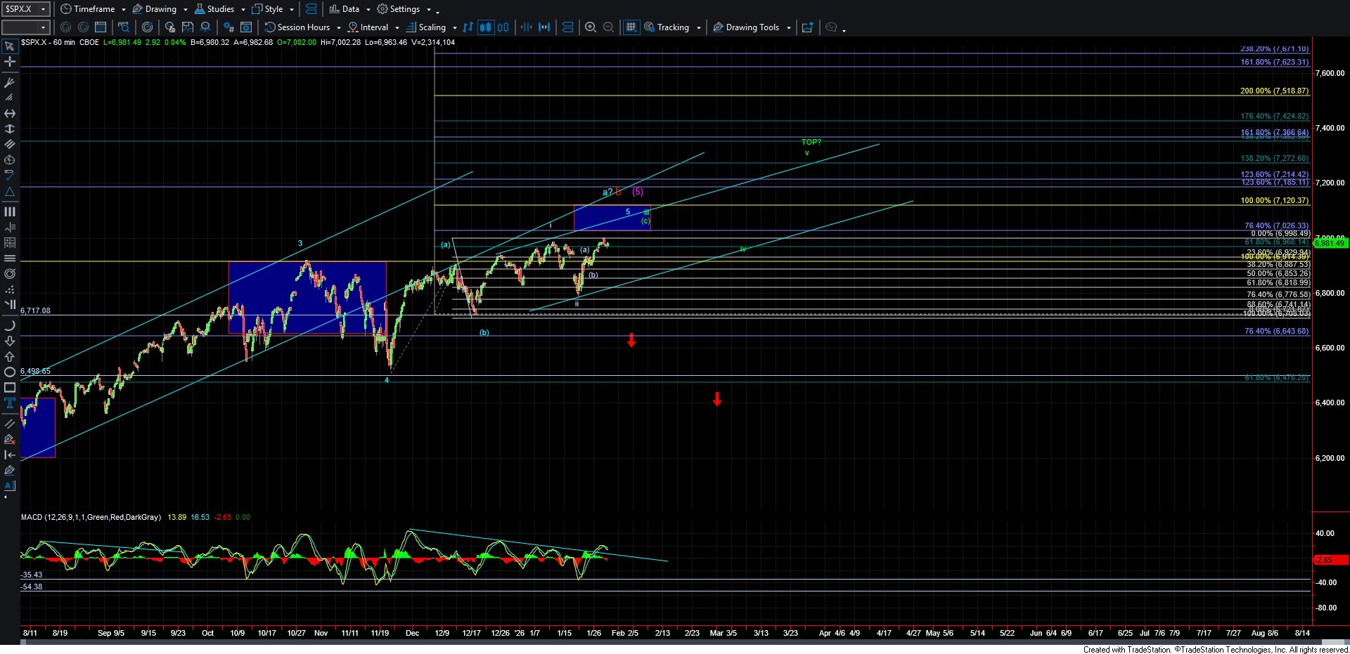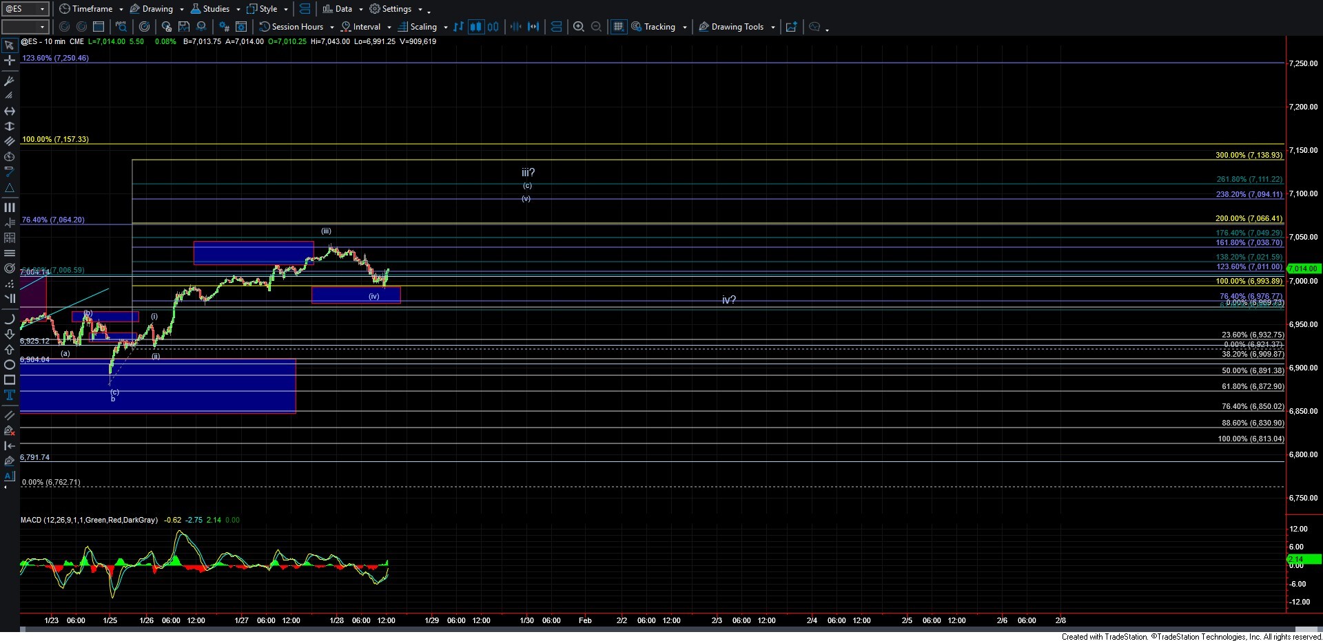 If we are unable to hold over that micro support zone, it would suggest that we have put in at least a local top with today’s high. Should that occur, we will then need to watch the 6900–6850 region below as larger support. If we begin to break down under that region, followed by a break under the 6813 level, it would start to give us an early indication that a larger-degree top may have been struck.