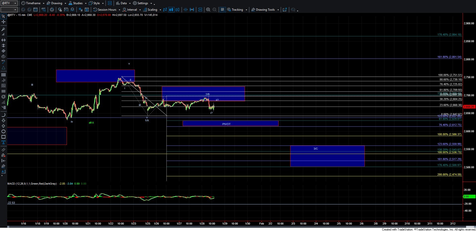 The RTY chart is telling a bit of a different story, with what can be counted as five waves down off the 1/22 high, followed by a corrective retrace into today’s high, which was then followed by another potential five down into today's low. This gives us a possible 1–2, i–ii setup to the downside. So again, while the ES and NQ are both still holding over support, this potentially bearish setup on the RTY certainly has the caution flag waving.