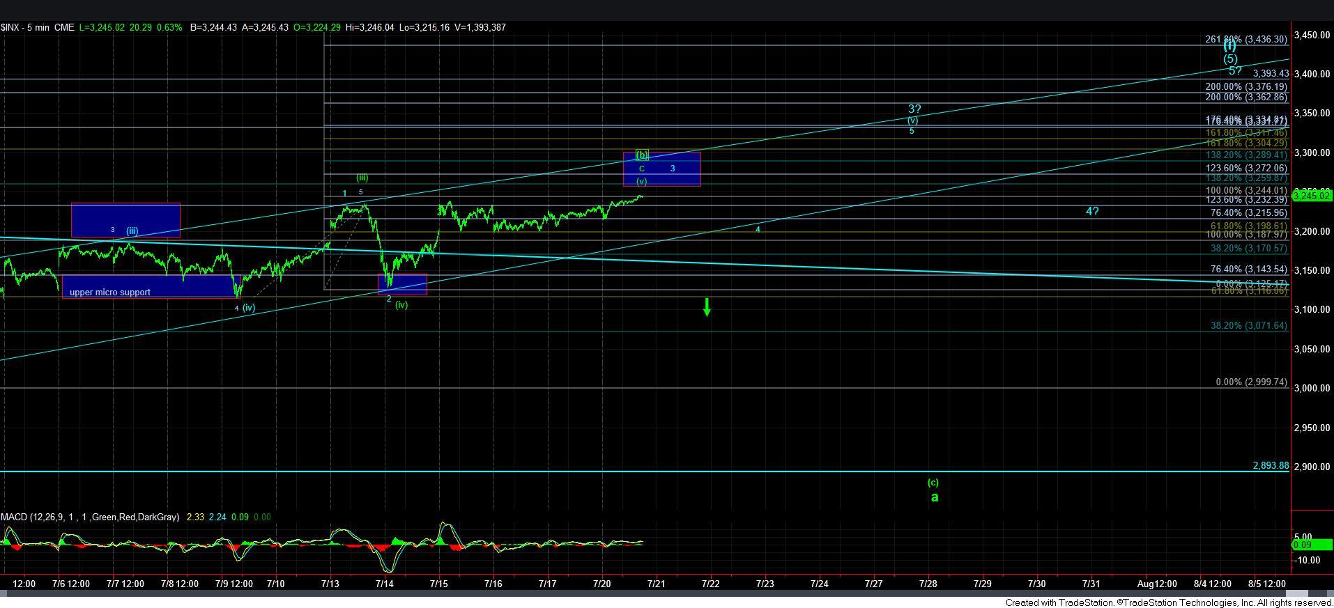 So, at this point in time, I have added a micro count for wave [v] of 3 in blue which suggests we are rallying in the wave 3 of an ending diagonal. Now, the standard target for wave 3 within an ending diagonal is the 1.236 extension of waves 1 and 2. That would suggest that if we are indeed within an ending diagonal, the market should attempt to stretch into the 3270-80SPX region followed by another drop back down to the 3200SPX region in a corrective fashion for wave 4 within wave (v) in blue.
