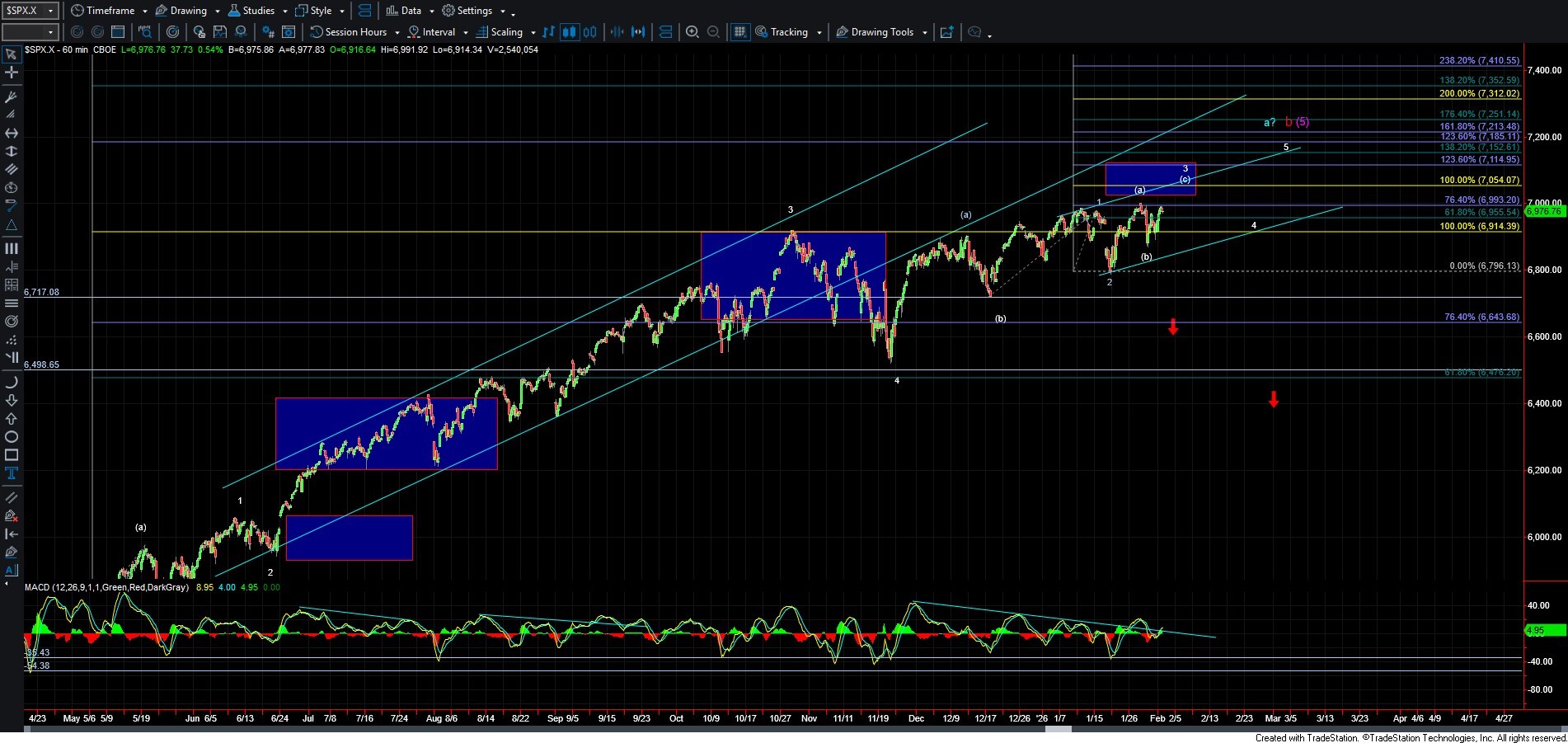 As shown on the ES chart, the current overhead pivot is the 7006–7040 zone. If we can manage to push through that area, the next key resistance level comes in at the 7080–7094 region. This represents the 100% extension on two separate degrees, and if we stall there and see a pullback, it could mark the top of wave 3 within the larger Ending Diagonal that began with the December low.