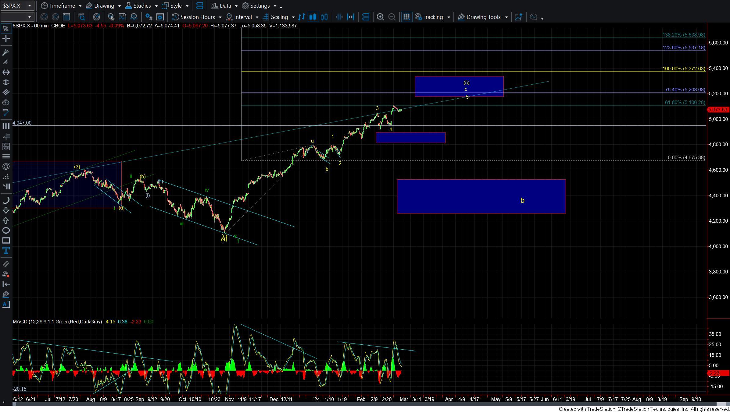 I do want to note that I have added an alternate count as shown in red. Under this case, I would count the entire move up off of the 2/13 low as an Ending Diagonal. In this case, we would need one more higher high to finish off the pattern. This is still an alternate path at this point in time however if we can hold around the 5000 level and turn higher to new highs on three waves then this path will become more probable.