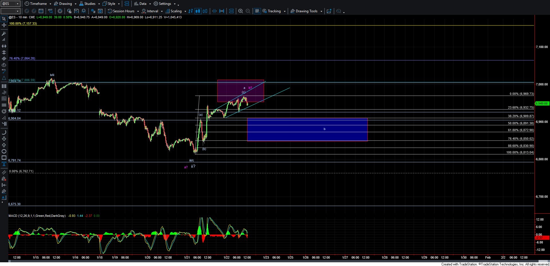 As shown on the ES chart, I am currently tracking two paths. The bullish path, which targets new highs, is shown in white. The bearish path, which takes us back below yesterday’s low, is shown in purple. The fact that we only have three waves off the low does not invalidate either scenario since the white count allows for additional upside within a larger ending diagonal.
