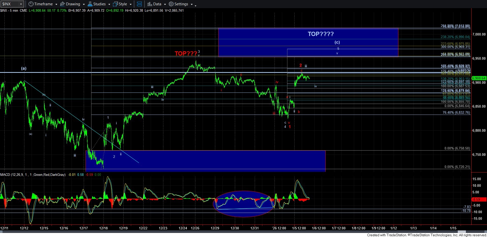 Furthermore, as long as the market remains over 6887 (the 1.00 extension of waves i-ii), then I will continue looking higher for the completing of this 5-wave move off Friday’s low. Should we break down below that support before completing 5-waves up, that will open the door to the red count.