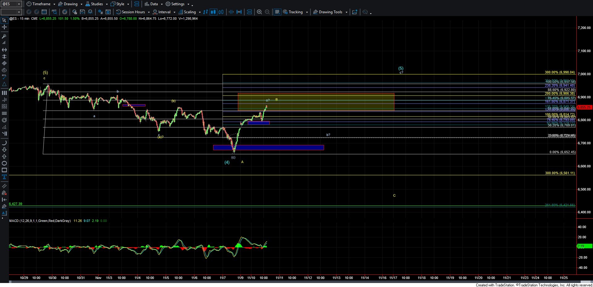 As shown on the ES chart, the current resistance zone for the yellow wave B sits in the 6841–6922 region, and we’re currently right in the middle of that range. If we continue to push higher and move through the upper end of this region, it would likely suggest that we’re on our way to new highs as part of the blue wave (5).
