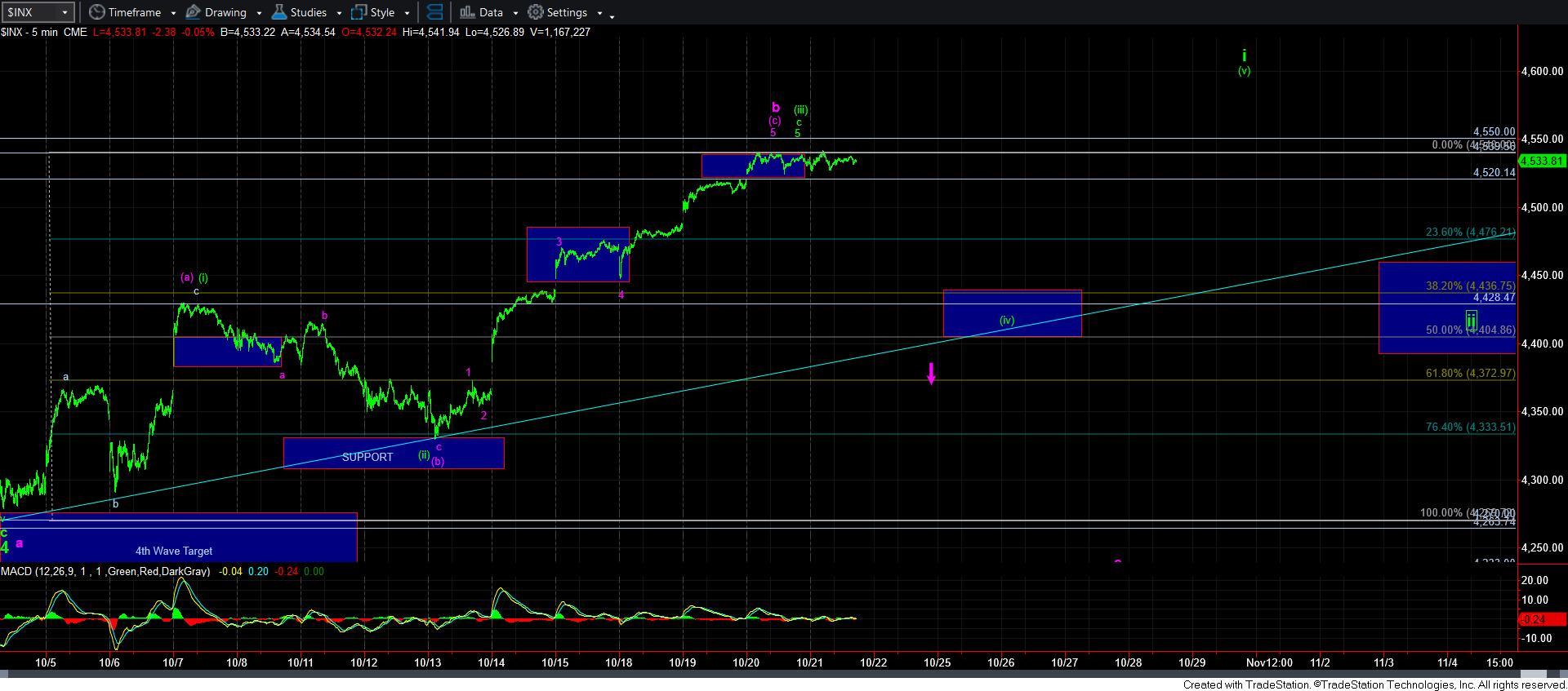 So, for now, as long as the market holds the 4508ES support, it still has a path higher to the next resistance region outlined on the ES chart. However, if we can break back below 4508ES sooner, then the nature of the decline will provide for us indications as to whether the pullback is a corrective wave [iv] in the green count or the start of the purple c-wave. For now, I lean towards the green, but will make final decisions based upon the nature of the next decline below 4508ES.