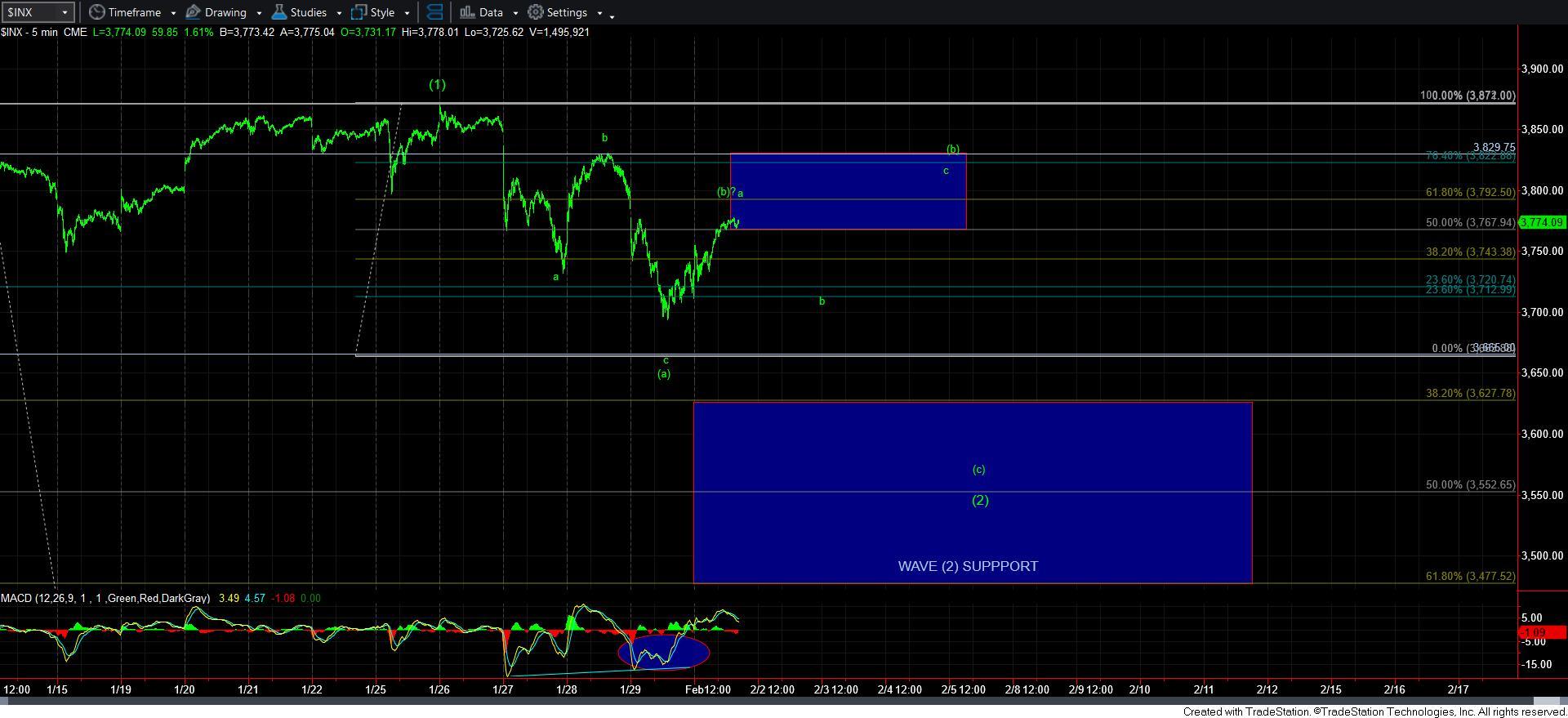 Well, if I would give you my ideal preference, I would probably suggest you review the a-b-c structure in green on the attached 5-minute SPX chart, which would suggest we can spend several days within a [b] wave within wave [2]. But, as I said, there is no set pattern within corrective structures, so it is entirely possible that all of the [b] wave is completing with this rally. But, the more preferable path would be for it to take more time and provide us with a “fuller” [b] wave.