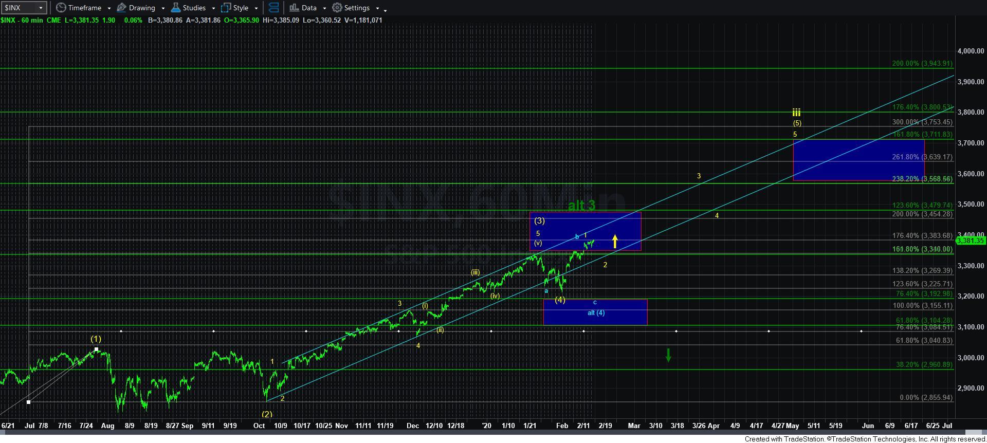 But, ideally, as long as the SPX remains below 3383/88, then I can still reasonable expect more of a pullback before the next larger rally takes hold. However, if strength continues directly through 3400, that becomes a much lower probability, with the more likely path becoming a more direct break out.