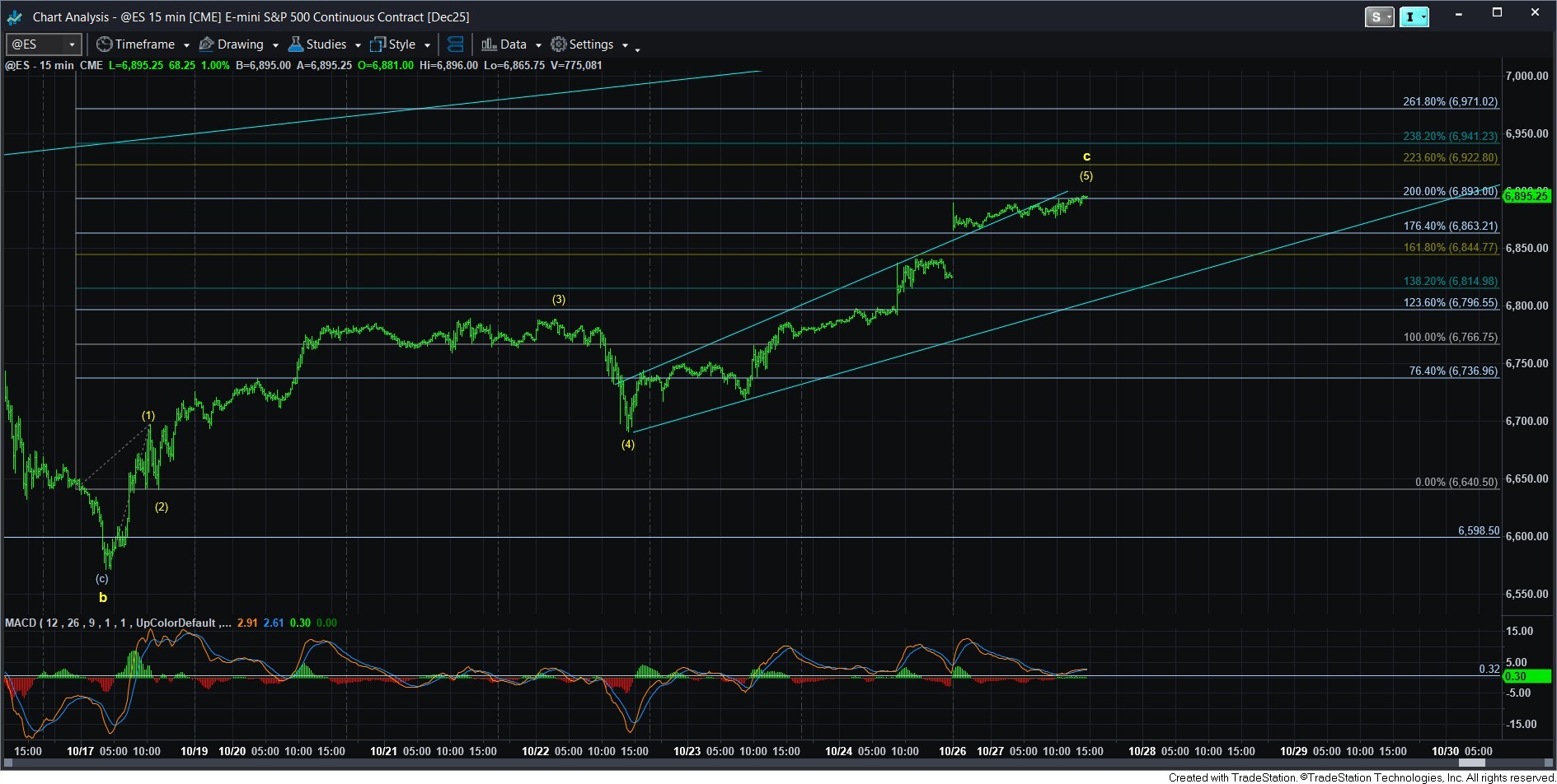 Over the weekend, I outlined the upside targets/resistance in the 6832-54SPX region. And, today’s gap up moved past that initial resistance region. But, on the 15-minute ES chart, we have been hitting our head on the 2.00 extension of waves (1)(2) in the ending diagonal structure I have been tracking of late. And, I still think this is a very reasonable interpretation.