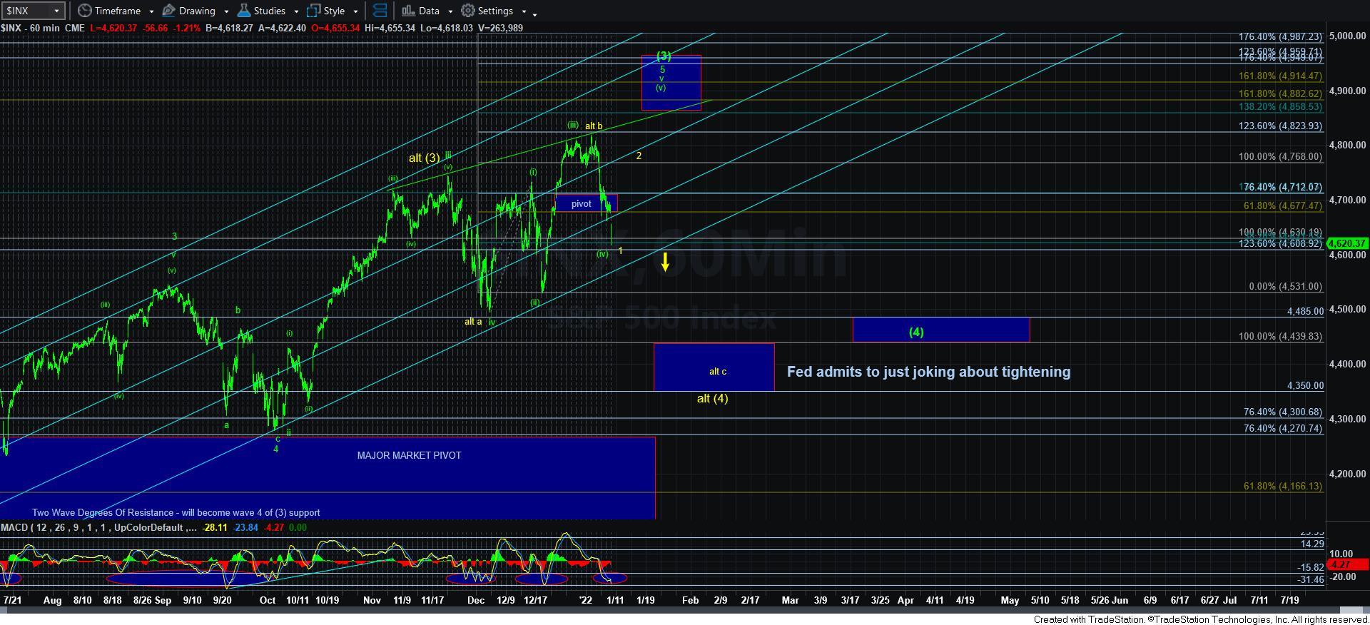 While the market is extremely oversold at this time, support seems to be trying to break in here, which is not what I expected in direct fashion. But, if we see a break down below the 4600ES region, then it opens the door to the yellow count as shown. It means we can see a continuation towards the 4535-4560ES region, followed by a bounce back to the pivot. If the pivot holds, then we follow through down to the 4400 region. But, if we break back over the pivot at any point in time, the market remains in the diagonal. There is still potential for whipsaw here.