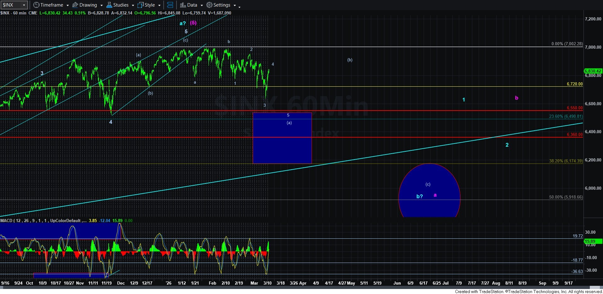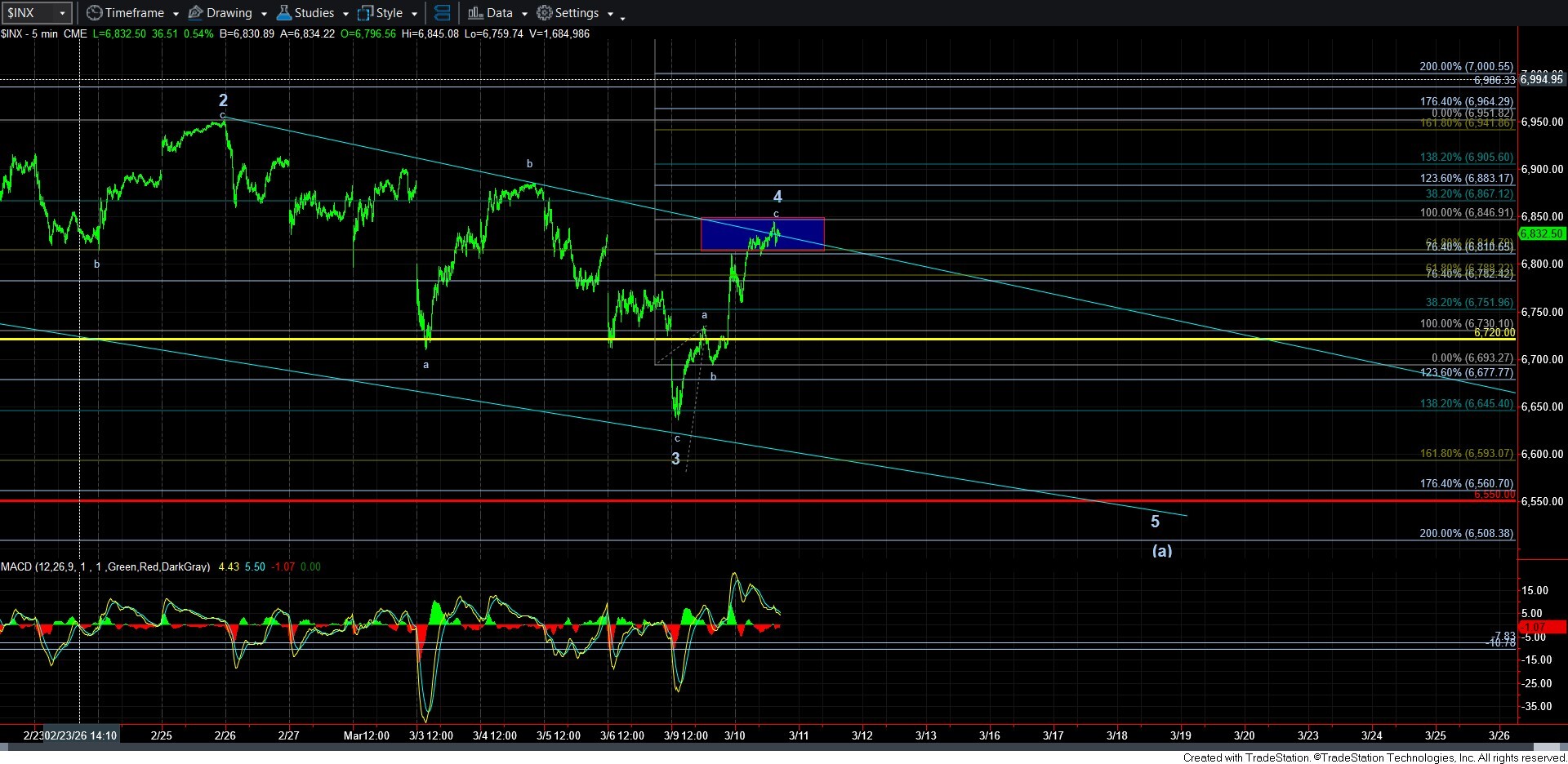 “We are now approaching the 1.00 extension wherein we would have an a=c in a potential corrective rally. A break below the .618 extension in the 6785SPX region is what we would need to see to get a first indication of the potential 5th wave in the ED down. But, keep in mind that it will not likely be impulsive since it would be an a-wave in the 5th wave, and they are most commonly 3-wave structures. So, it will be indistinguishable from a corrective pullback that would be pointing to another leg higher.”