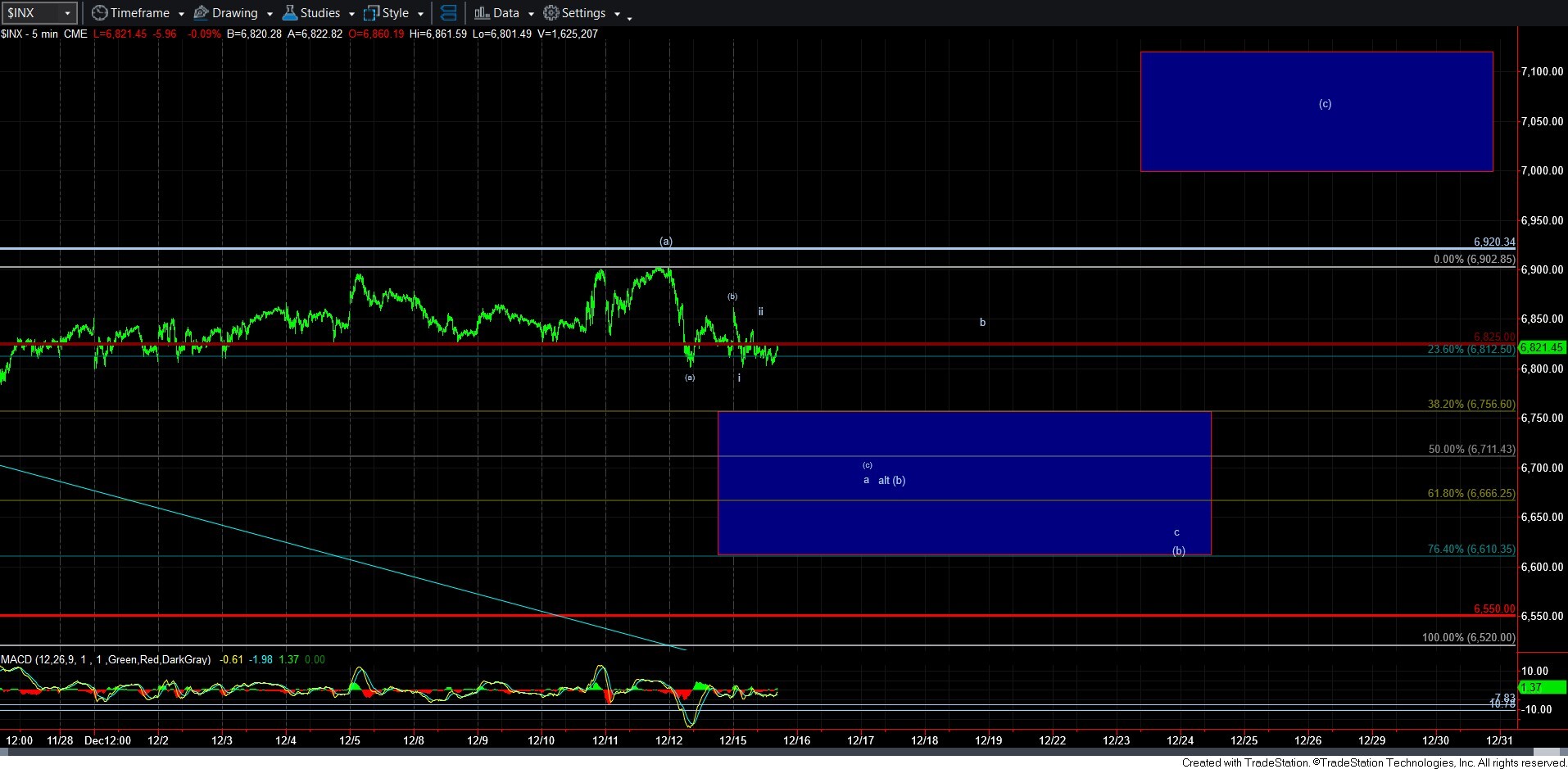 With the market spiking higher this morning into the open, we seem to have completed a (b) wave consolidation structure. You can see this labeled on the attached 5-minute SPX chart. This now suggests that the market is setting up a (c) wave decline to test the support box below.