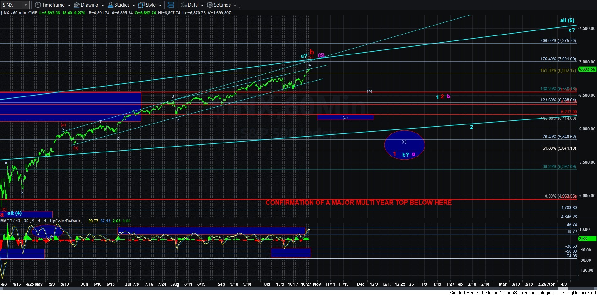 In fact, if you are given this larger degree structure without more than a .236 retracement the entire way up, 8 or 9 out of 10 times this would not likely be the result, in my humble opinion. That is why I view this as such an anomaly, as it is so rare to see this type of move. But, as I mentioned above, it is likely doing its job in convincing the masses that the equity market is invincible. And, this is why I think that once this completes, the potential for the alternative blue count on the 60-minute chart will likely be rather low.