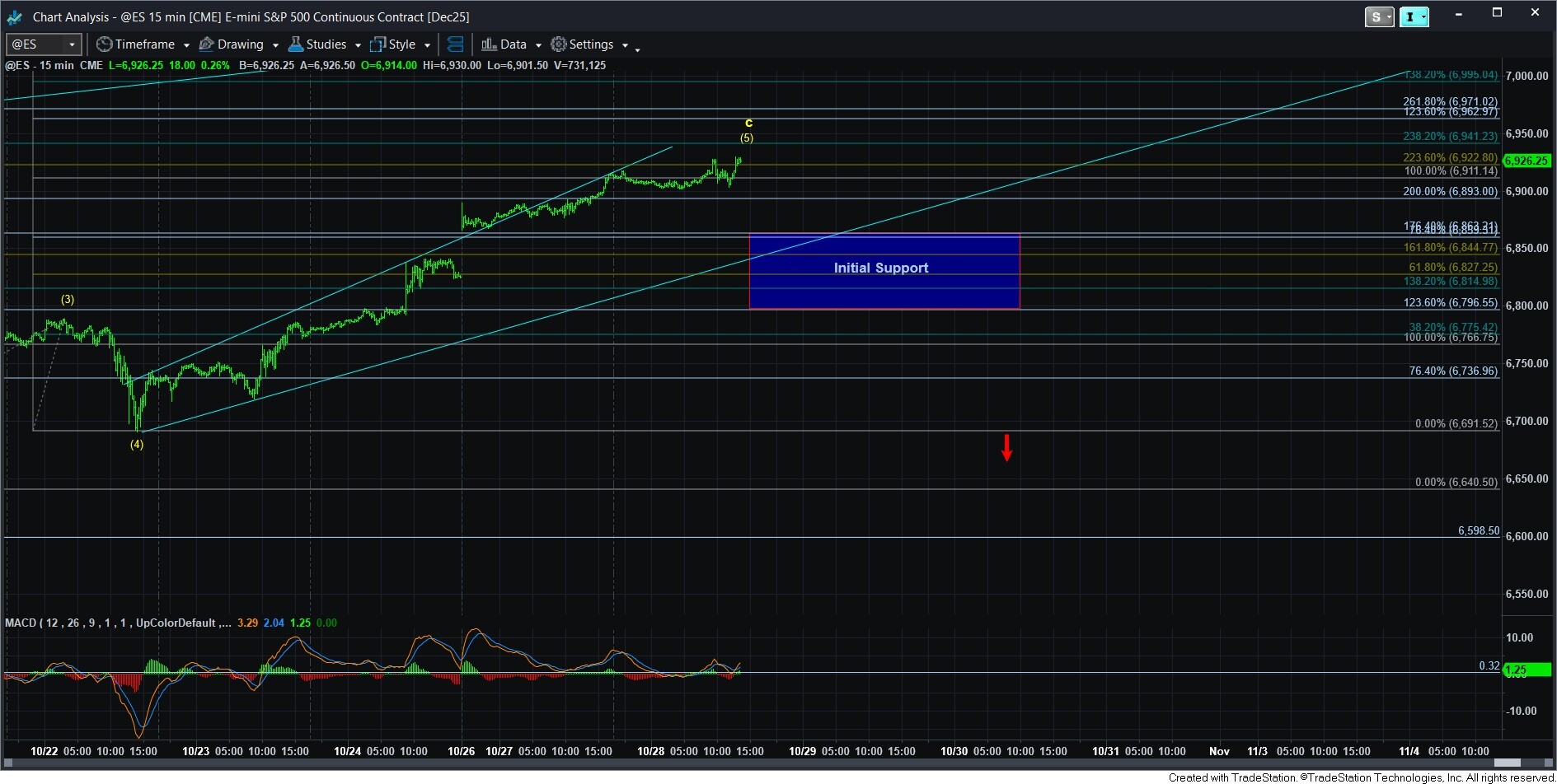 So, my apologies, but I simply cannot, with a good conscience, offer counts that are pointing much higher. Rather, I am posting support which you can use as you see fit. I have added an initial support box on the 15-minute ES chart, and a break down below that with follow through below the wave (4) low would be an initial signal to me of a top in place.