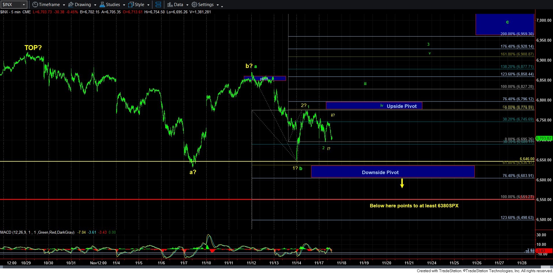 The overnight action in the ES last night provided us with a higher high, which does make the rally off last week’s low seem more like a 5-wave structure for wave 1 of the c-wave rally in green. However, the SPX does not have that additional move higher. It still remains below its resistance of 6774SPX . . for now.