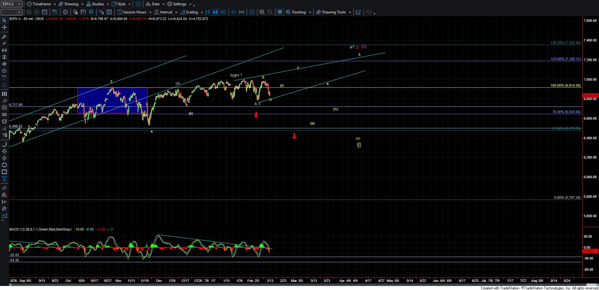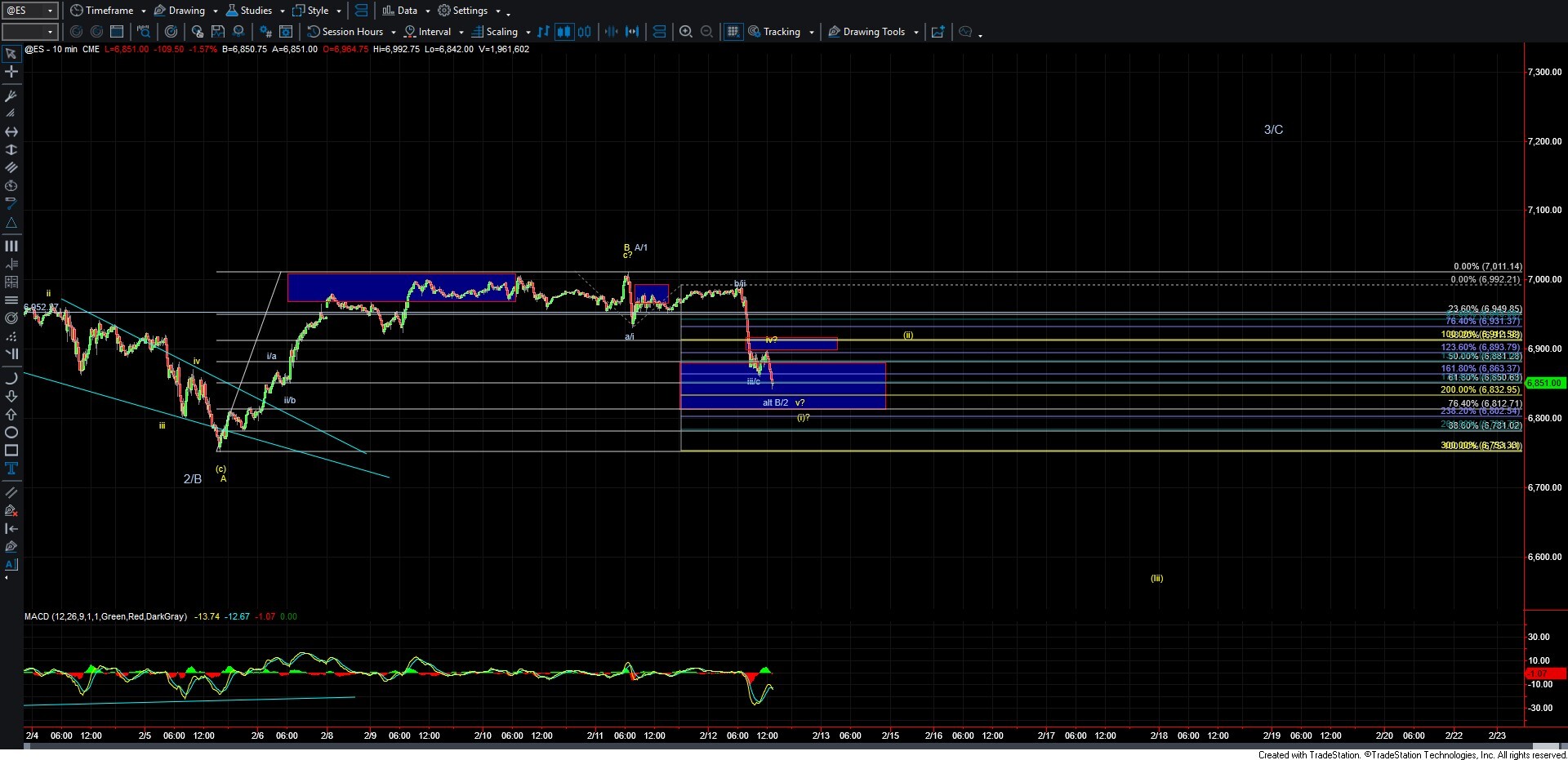 The market made a lower low into the close, which opens the door for a potential five-wave move to the downside per the yellow count. While we still need confirmation—specifically a corrective retrace higher followed by a break of the low, the setup now allows for the possibility of a substantial move lower in wave (iii) of the larger wave C.