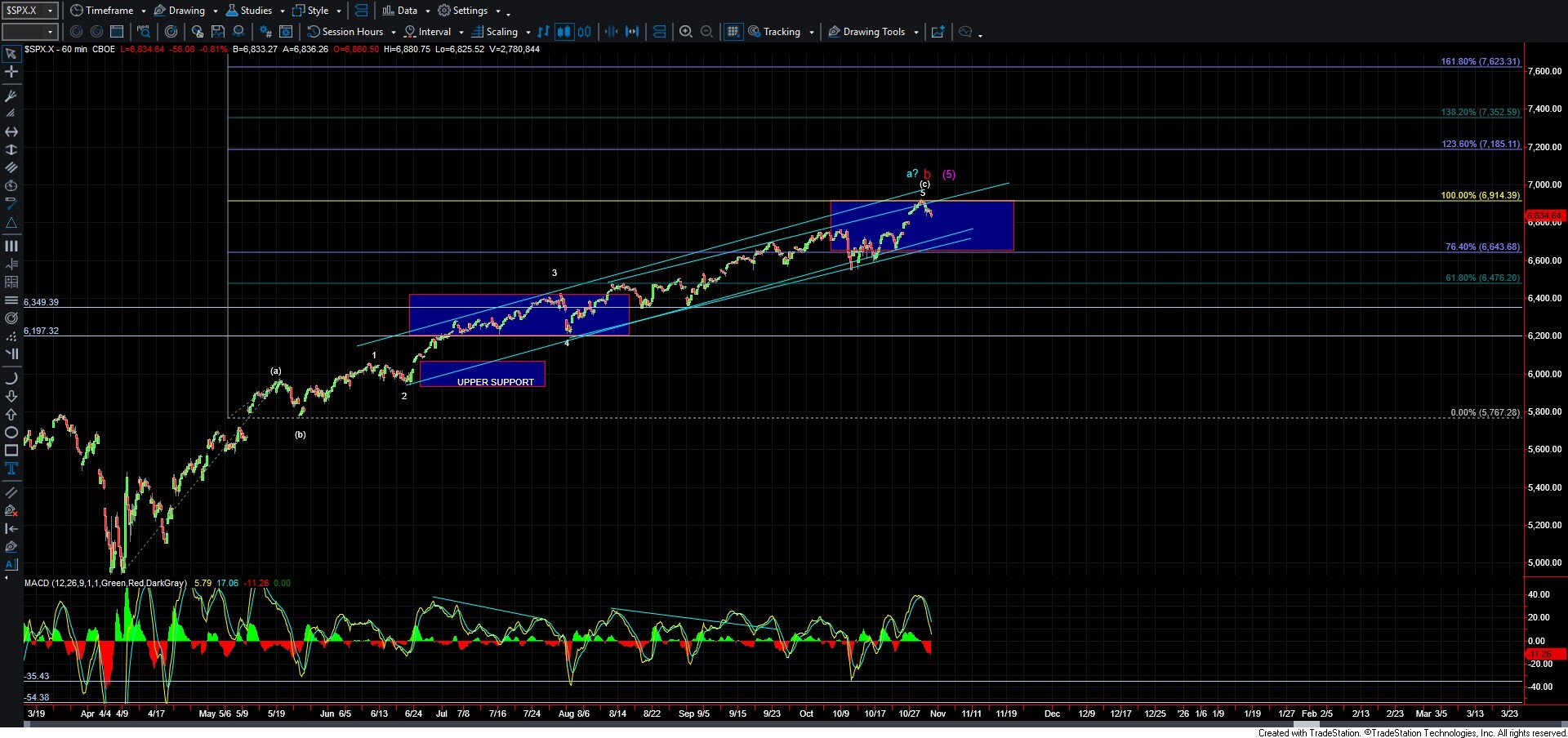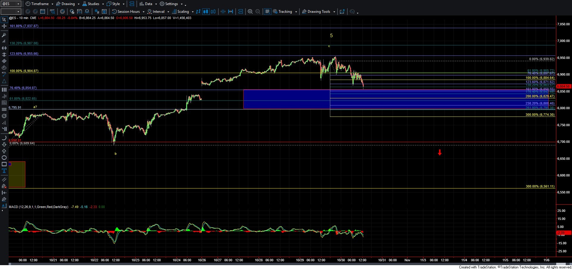 Overall, there isn’t much to add to the prior analysis. Today’s move took us into the upper portion of the support zone, which I currently have in the 6,850-6,795 region. I’ll be closely watching the structure of the next move higher to determine whether it presents as corrective or impulsive, as that will provide valuable clues about whether a top may already be in place.