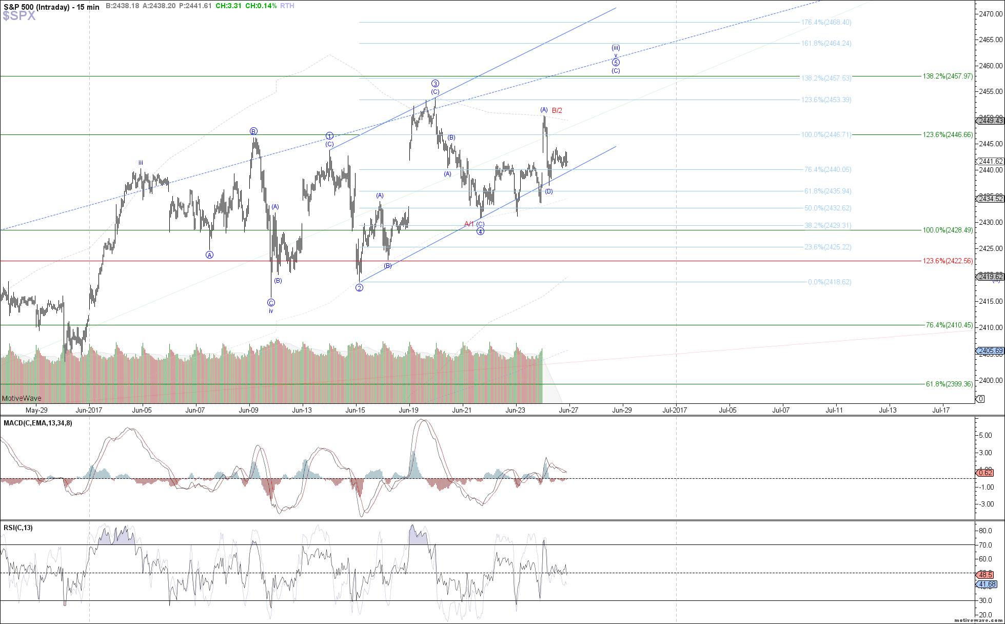 Despite trading strongly higher after the open, the market could not hold those gains and rolled back over soon after. Price continues to make higher lows so far though, holding above last Friday's low for now as well as last week's low. Therefore, until at least one of those support levels is taken out (starting with 2433.50 SPX), then the blue count still has a shot at reaching 2458 SPX as wave 5 of the ending diagonal wave v of (iii).