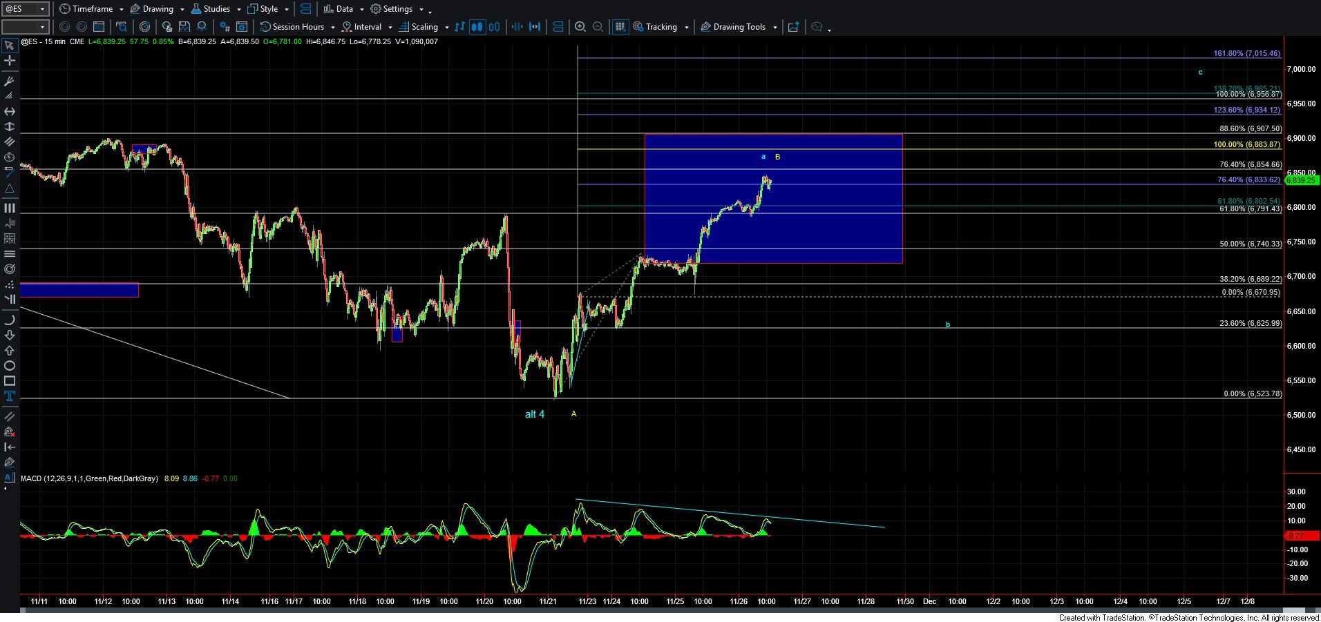 This strong move off the lows over the past several days has certainly exceeded my expectations and keeps the path to new highs alive. With that said, we’re now approaching the upper end of the resistance zone for a potential larger top, one that still could take us back under last week’s low, as we only have three waves up off that low.