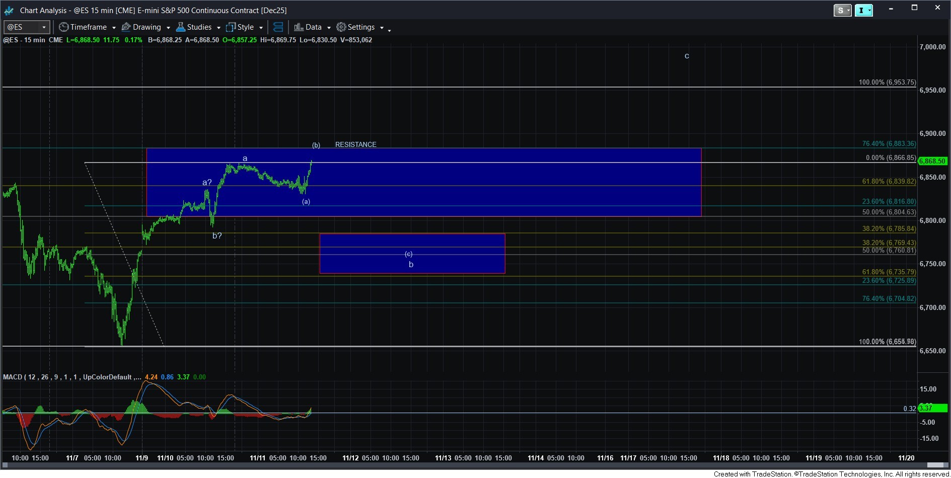 For now, I would clearly prefer to see more of a b-wave pullback to the support box noted on the ES chart, which represents the .382-.618 retracement of the a-wave. However, if we begin to break out over the resistance box and the .764 retracement region in the 6883ES region, then I am going to have to move to the one hour pullback last week representing all of the b-wave we get.