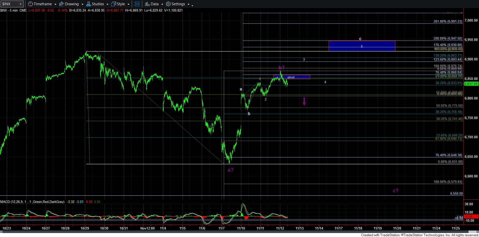 The other option is if we see an impulsive break-down below 6805SPX. This can suggest that we are topping in a b-wave rally just north of the .764 retracement of the recent decline. If the top of that b-wave was struck today, then it can point us down to the 6550-6580SPX region.