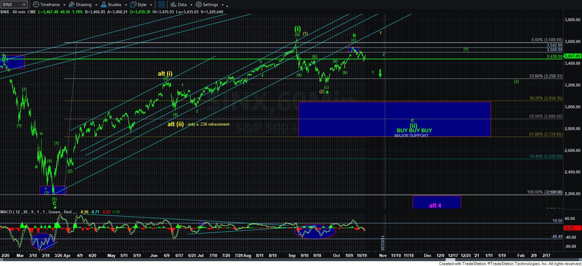 So, for now, I am tracking the potential for the leading diagonal down to complete wave 1. That means that as long as we respect the 3470-85ES resistance, I am looking for us to continue down to the 3370ES region to complete wave iii in the leading diagonal for wave 1. Should we be able to move through that resistance, then it does raise the probabilities that the b-wave has not yet completed.