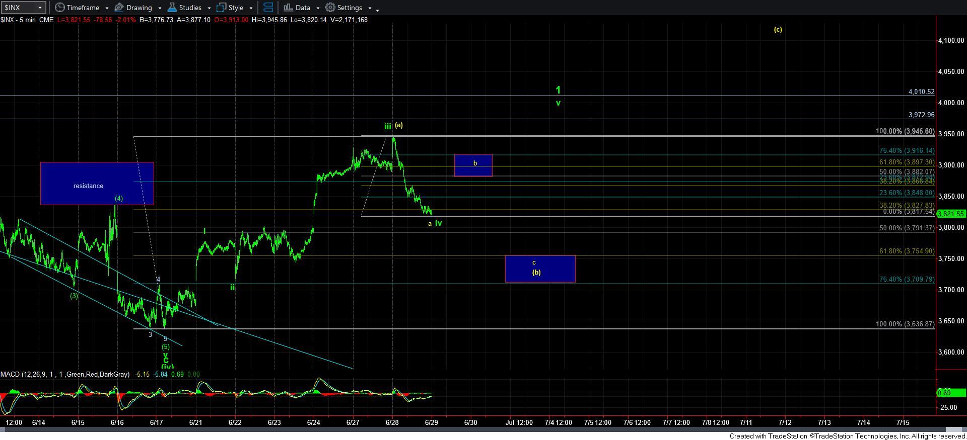 As you can see from the 5-minute chart, I am still leaving a bullish count potential for a leading diagonal outlined in green. I do not rely upon leading diagonals as trading cues until the market proves it. That means we need to move DIRECTLY to the 3970-4010SPX region over the coming week or so, and then pullback in a corrective wave 2. Should we then rally back over the high of wave 1, I will then adopt the leading diagonal as a much higher probability count. But, I want to note that I remain VERY skeptical of this potential as it does not project high enough in a 5-wave structure in a standard ending diagonal to take us to new highs.