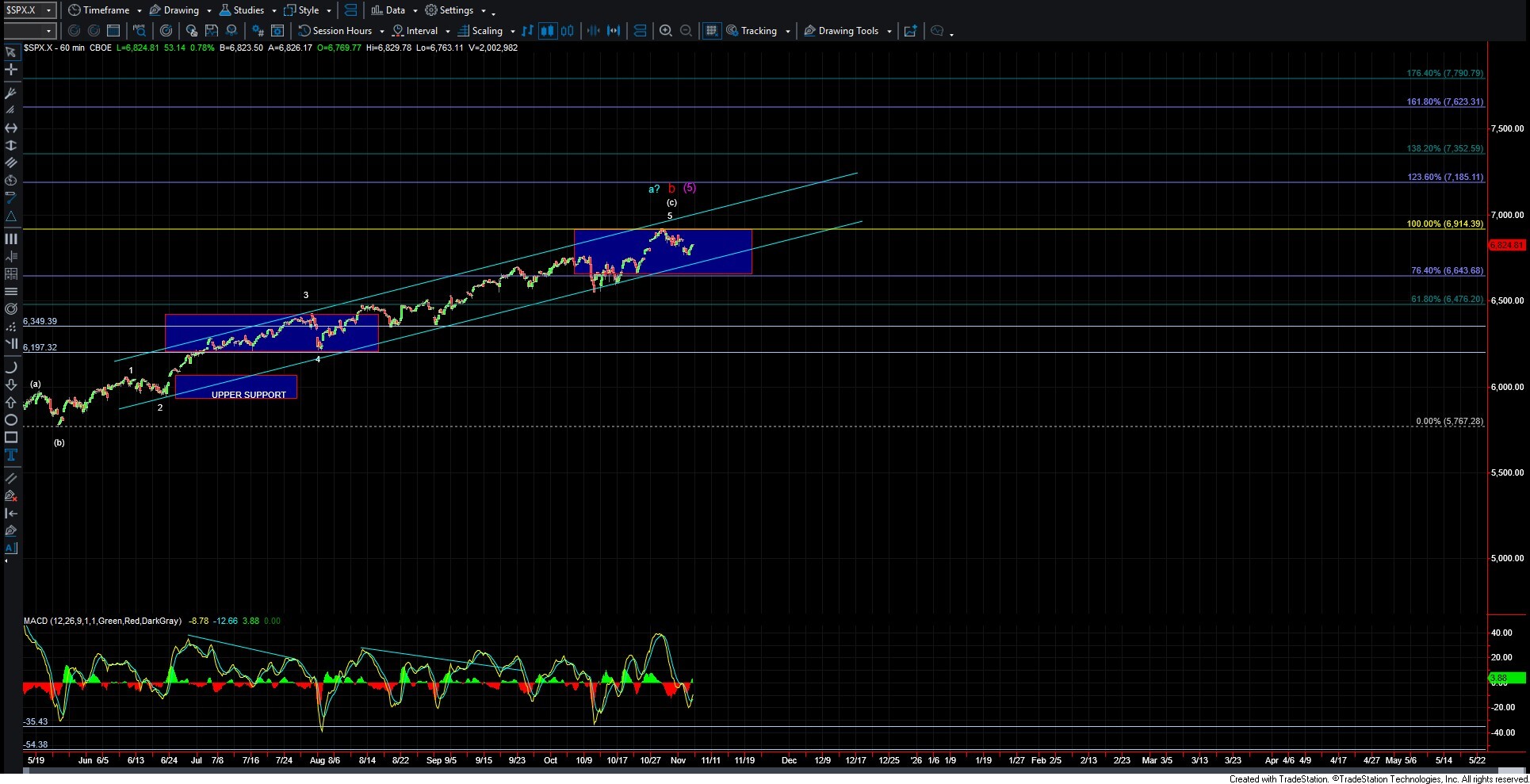 If and when that occurs, the structure of the next move lower will give us the next set of clues as to whether we are going to push to new highs per the blue count, or move lower once again per the yellow count. Should we see a three-wave move lower, then we likely push higher for a wave c of a larger wave (5) toward the 7000–7069 region. However, if we see a five-wave move lower followed by a corrective retrace higher, then the door would open for a potential top in the yellow wave (b).