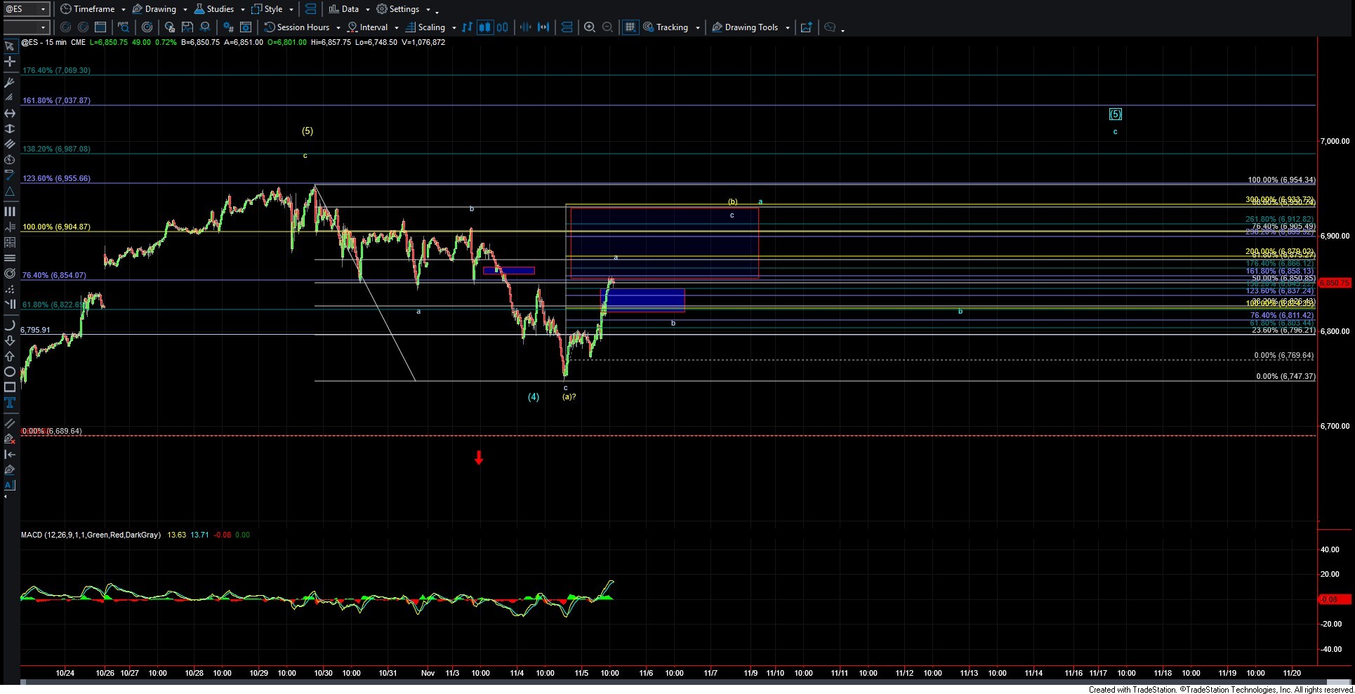 Drilling down to the 15-minute ES chart, we currently have three waves up off the low. This can still develop into a five-wave move—even as part of a larger a-b-c corrective move to new highs, but it certainly does not have to, nor would I say that this is a high-probability outcome at this point in time. The initial wave a off the lows could top at any point. A move back under the 6824 level would be the first indication that we have topped in that initial wave a up. As long as the action back lower remains corrective in nature, a move higher for at least a wave c of a larger wave (b), per the yellow count, is likely in the cards.