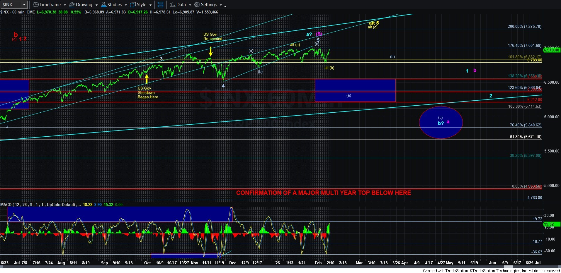 Once the market actually completes this rally, I will post the set up for the wave 2 support, which, if held, can present us with an upside follow through of 250-350 points, depending upon how deep the wave 2 takes us. For now, I have provided a guestimate as to that wave 2 support with the blue support box on the 5-minute SPX chart. And, once we have the wave 2 set, we can then use our Fibonacci Pinball structure to outline the upside pivot/resistance, along with upside targets for all 5 waves in this yellow (c) wave.