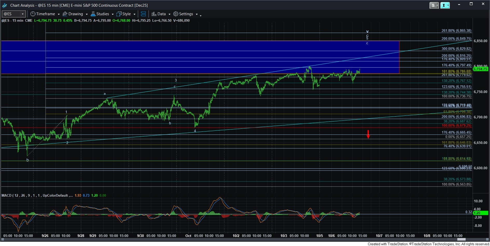 But, please do realize that should the market break down below the wave 4 low on that chart in the 6680ES region, that is an initial signal that a near term top has been struck. But, there is still a lot of action to be seen before it will suggest that a long-term top has indeed been struck.